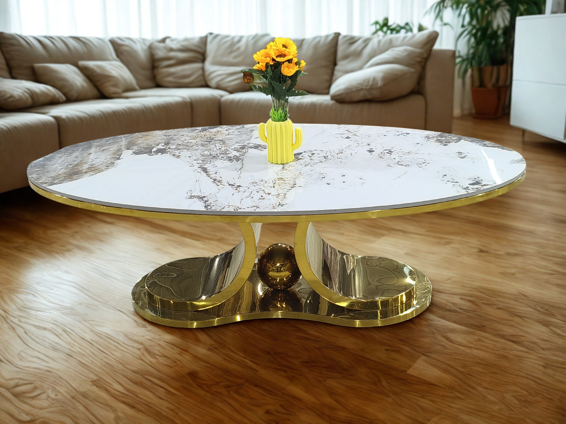 Bring timeless elegance into your living space with Aurea, a luxurious center table that seamlessly blends modern design with opulent detailing. Featuring a smooth oval marble-inspired top with natural stone patterns, it rests gracefully on a sculptural gold-finished base that exudes sophistication. Perfect for contemporary homes, Aurea is more than just a centerpiece—it’s a statement of style and refinement.