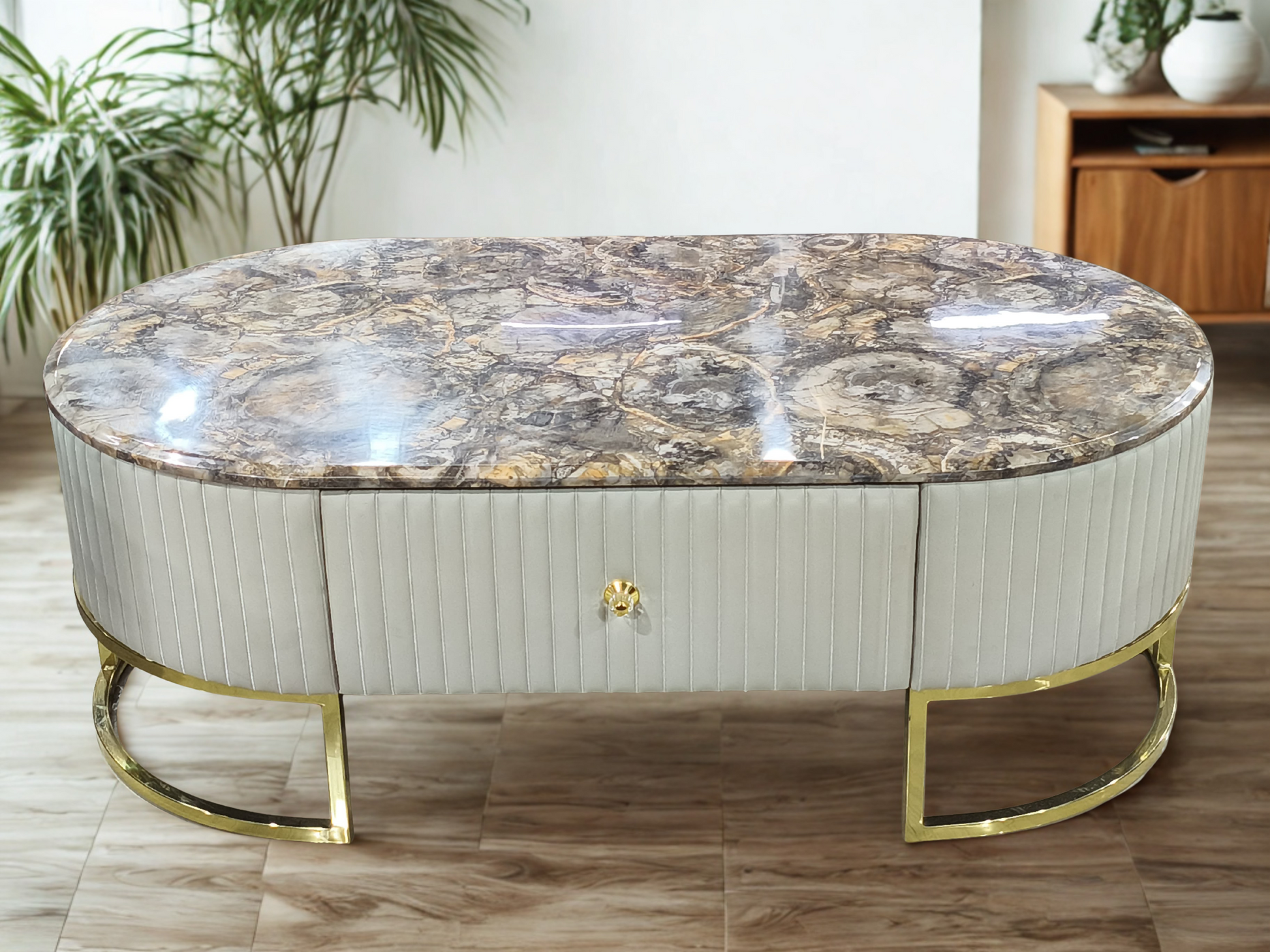 Introduce timeless luxury into your living room with Aurelia, an oval marble-top storage coffee table designed for both elegance and functionality. The stunning marble surface features rich, earthy tones and unique natural veining, while the upholstered body with vertical panel detailing adds sophistication. Complete with hidden storage and a golden stainless steel base, this table blends modern glamour with practical design.