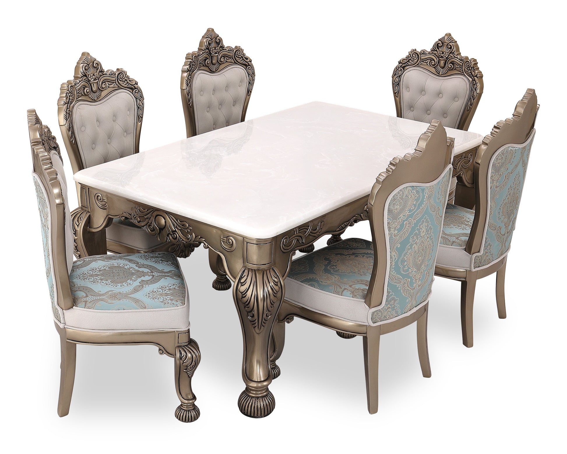 Elevate your dining experience with the BADSHAH dining set, a majestic blend of classic design and regal craftsmanship. Featuring intricately carved legs, upholstered high-back chairs, and a luxurious marble tabletop, this set brings a touch of royal elegance to any space.