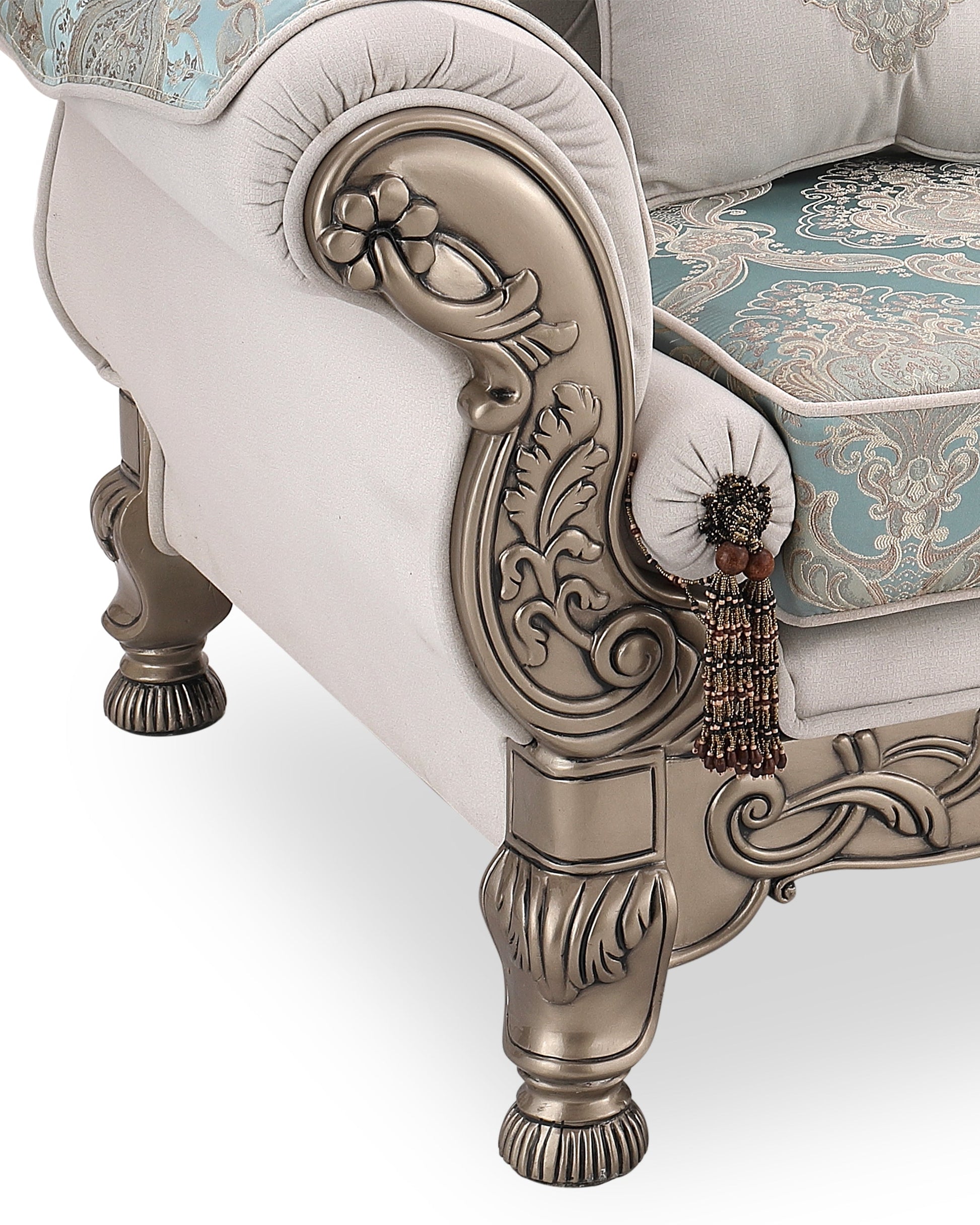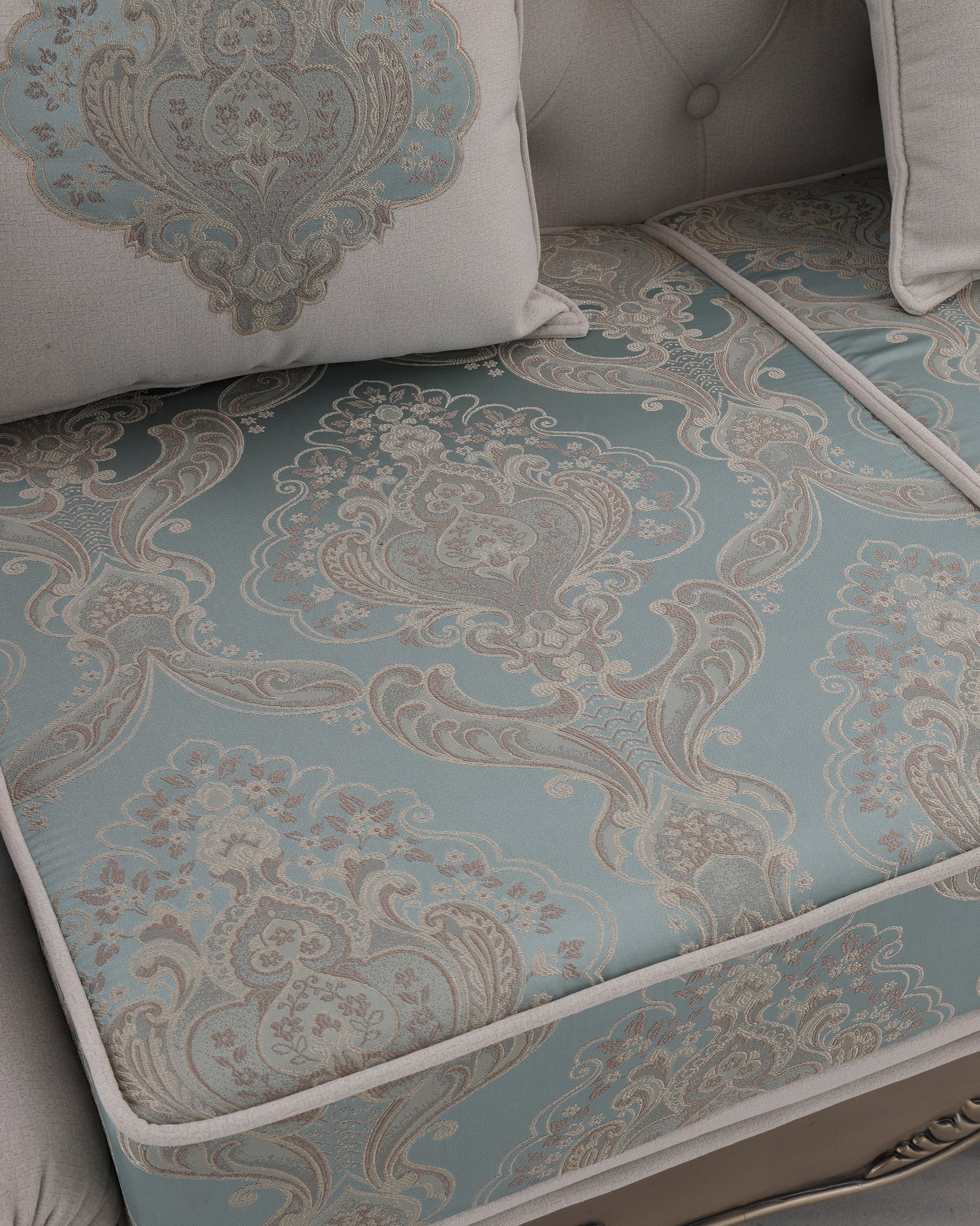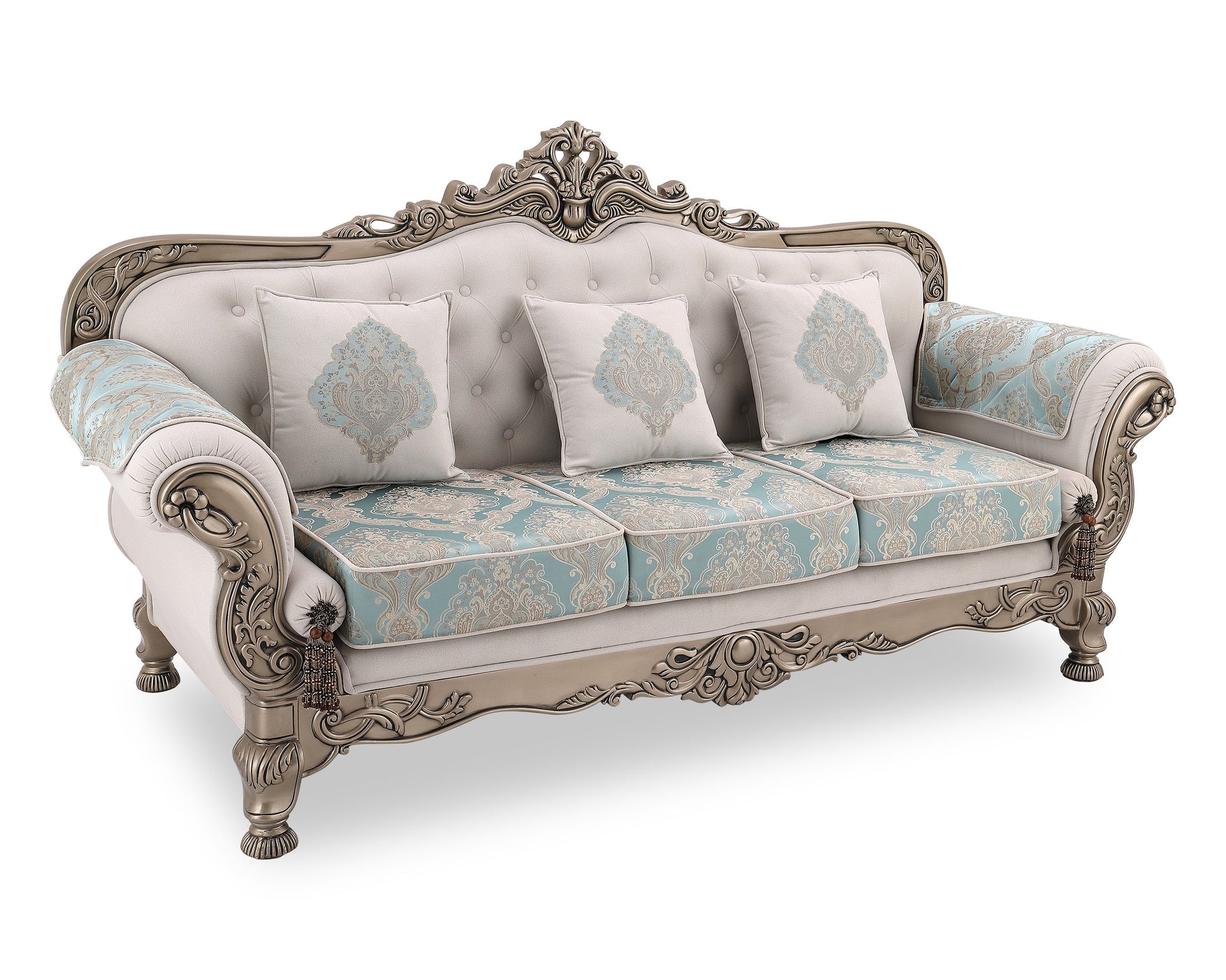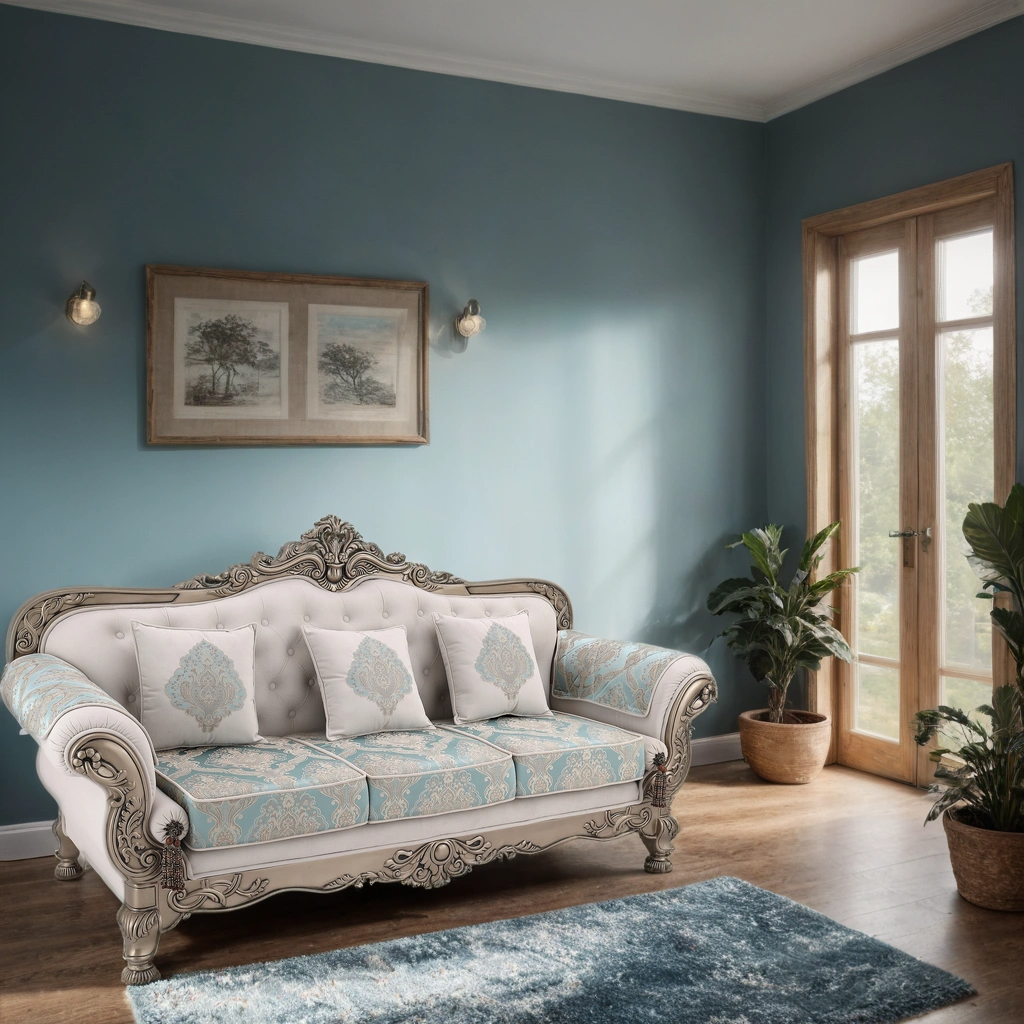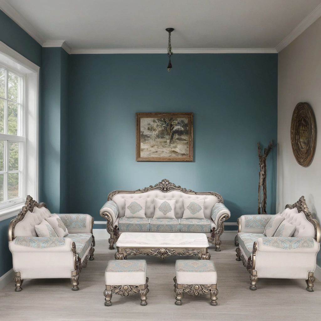 Transform your living room into a royal retreat with the BADSHAH sofa, where opulence meets heritage design. This statement piece showcases meticulously hand-carved wooden detailing, enhanced with an antique finish that echoes classical European artistry. The soft ivory upholstery is paired with rich aqua damask patterns, creating a stunning contrast that is both soothing and majestic.