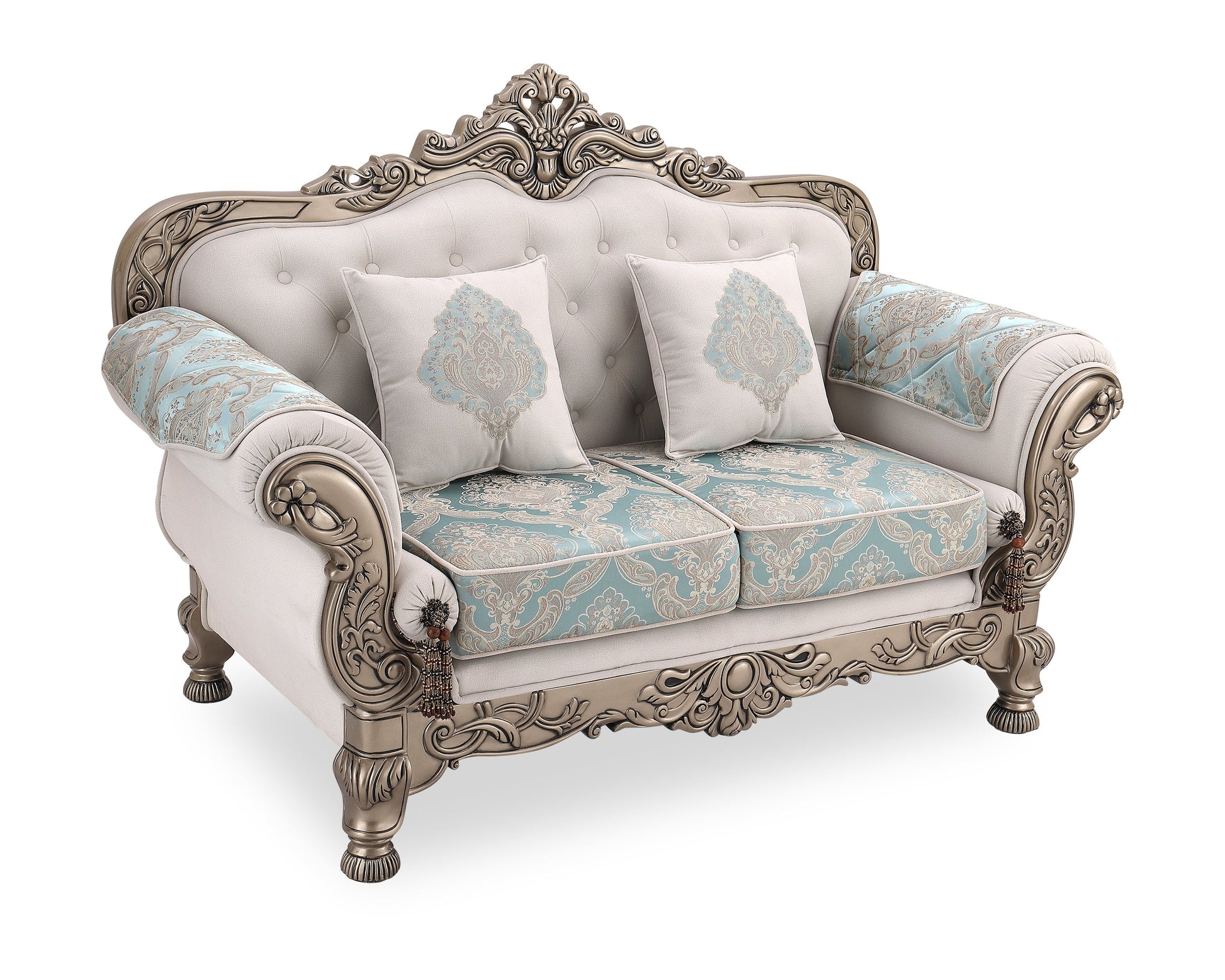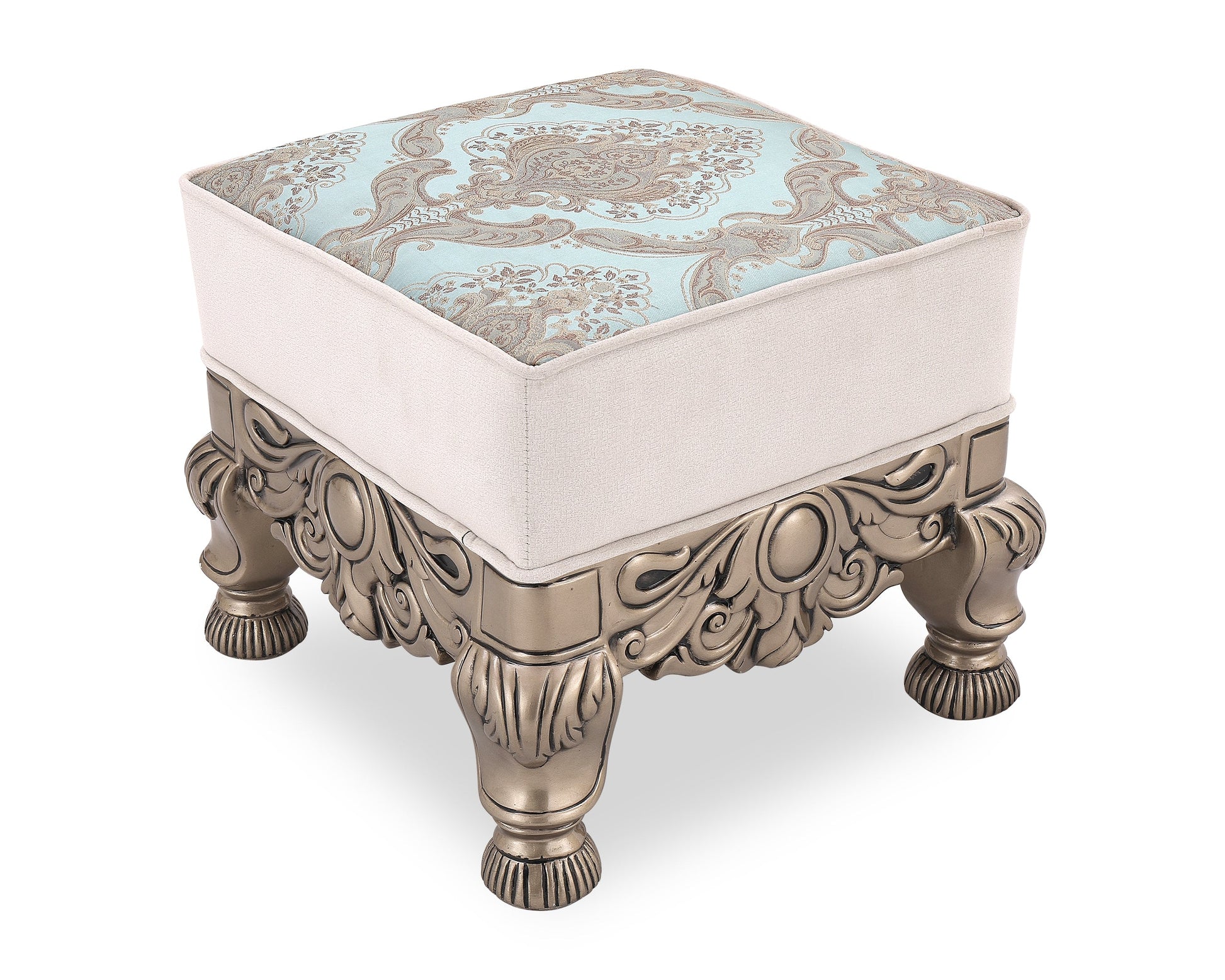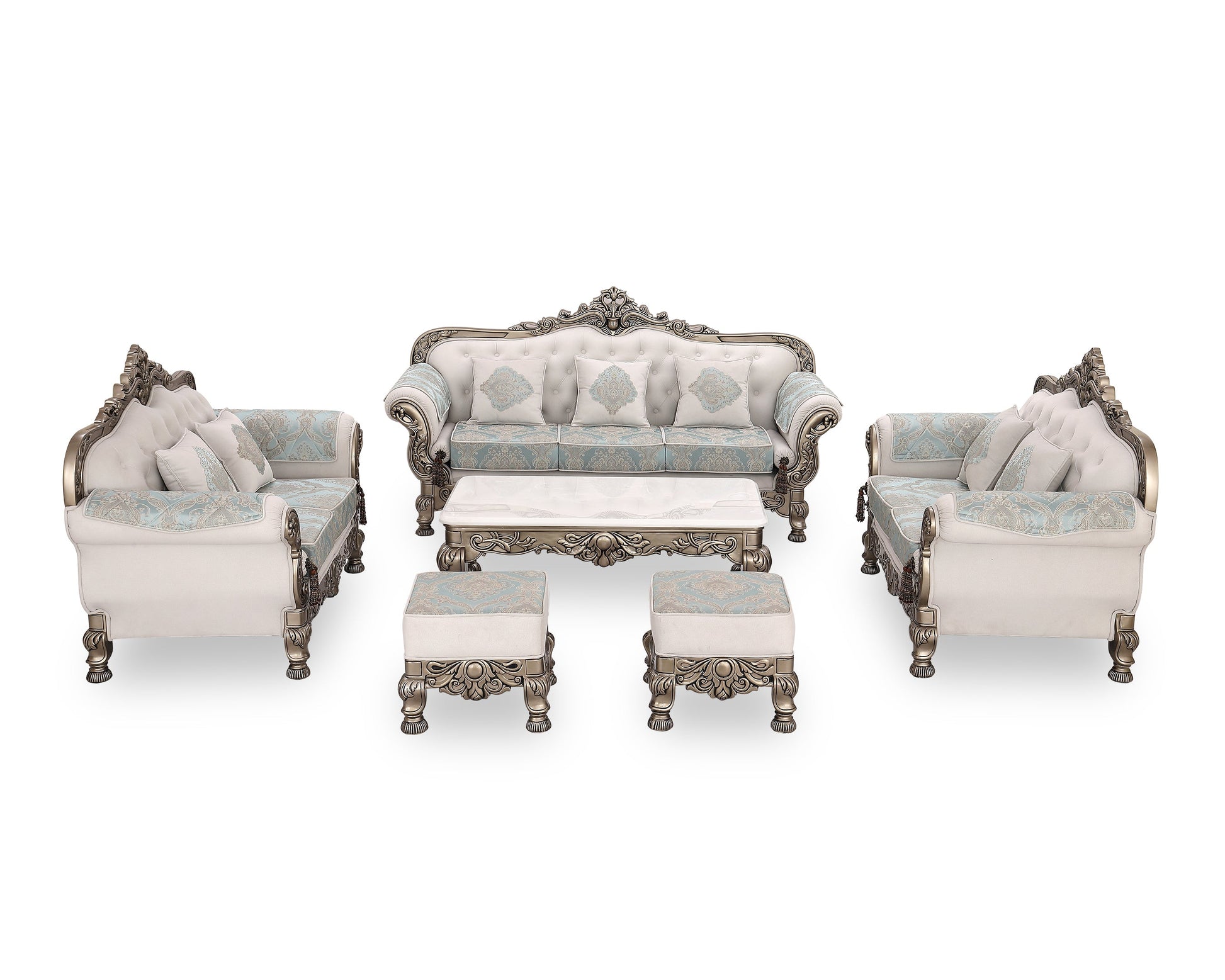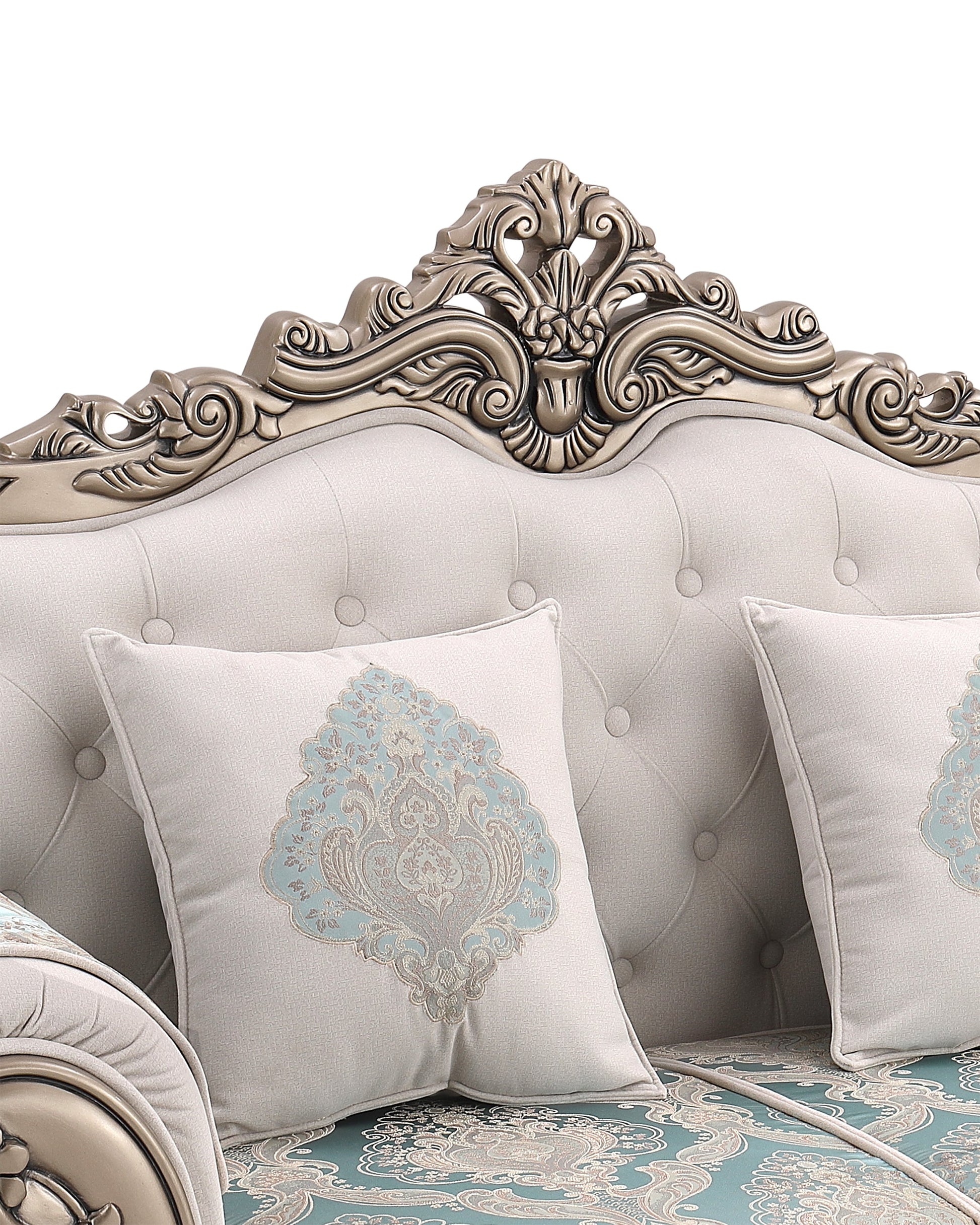 Transform your living room into a royal retreat with the BADSHAH sofa, where opulence meets heritage design. This statement piece showcases meticulously hand-carved wooden detailing, enhanced with an antique finish that echoes classical European artistry. The soft ivory upholstery is paired with rich aqua damask patterns, creating a stunning contrast that is both soothing and majestic.