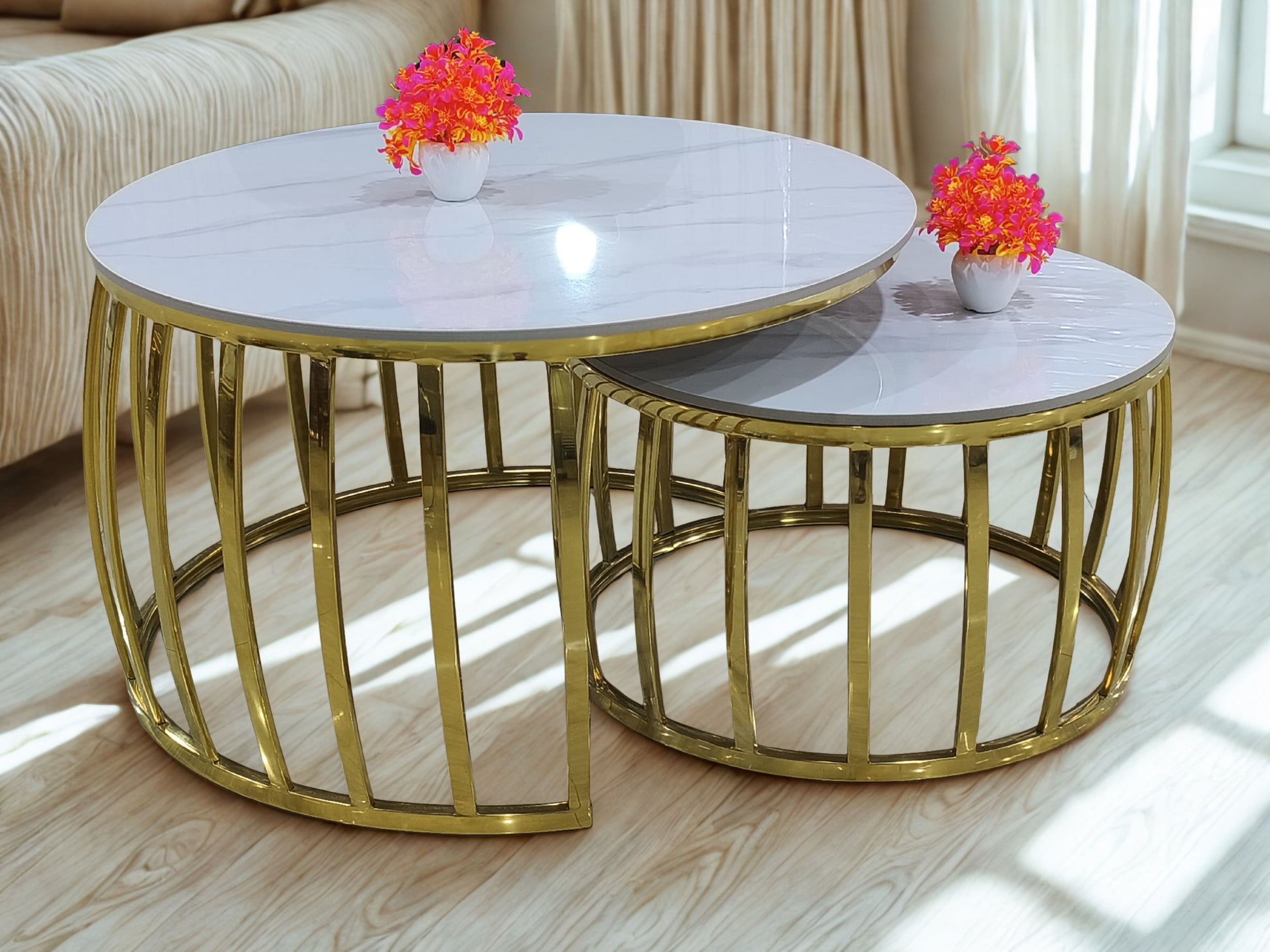 Introduce a bold touch of modern elegance with Cayra, a luxurious nesting center table set that blends artistry with function. The gleaming white marble-inspired tops sit gracefully upon cage-style golden bases, creating a statement piece that transforms any living room. Perfect for both compact and spacious interiors, Cayra delivers versatility, sophistication, and contemporary charm.