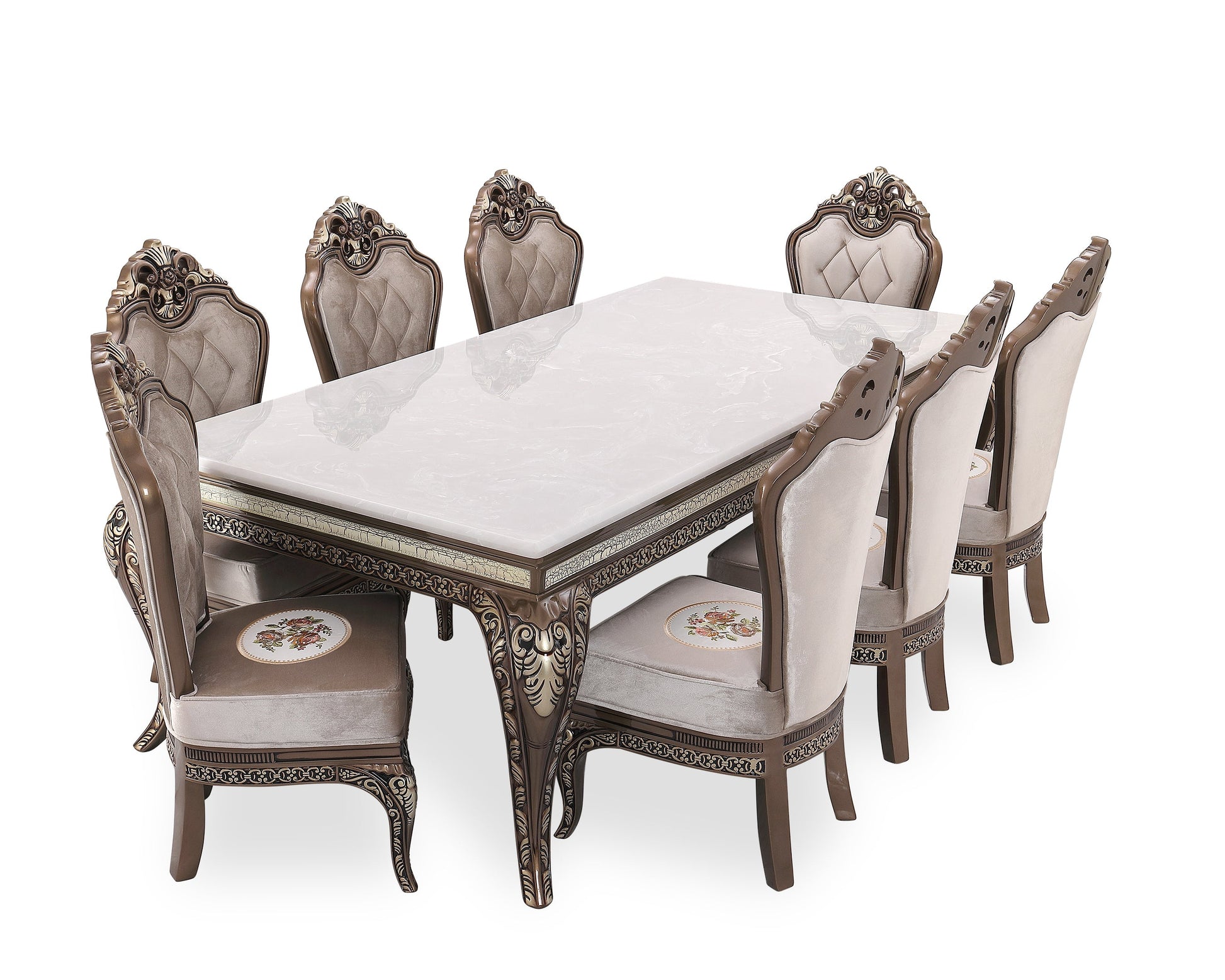 The DECCAN dining set is a majestic statement of grandeur and timeless design. With intricately carved solid wood frames and a generously sized polished marble tabletop, it’s crafted to host royal feasts and elevate any luxury dining space.
