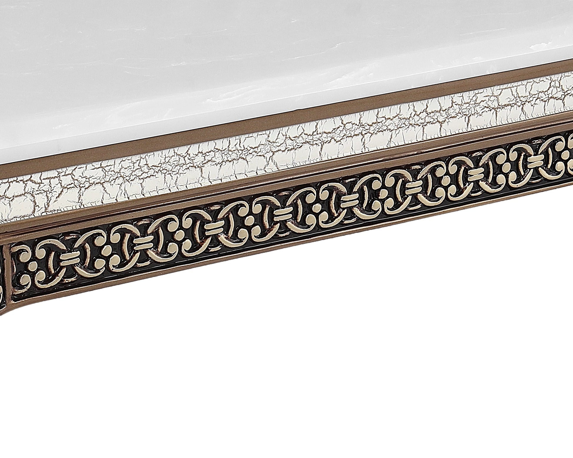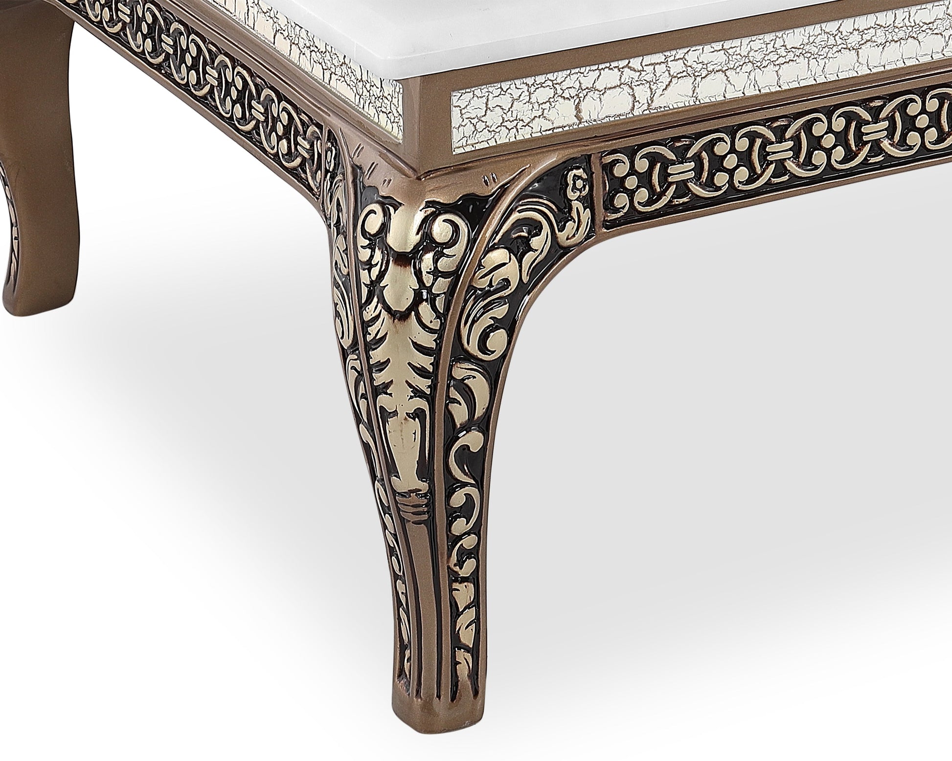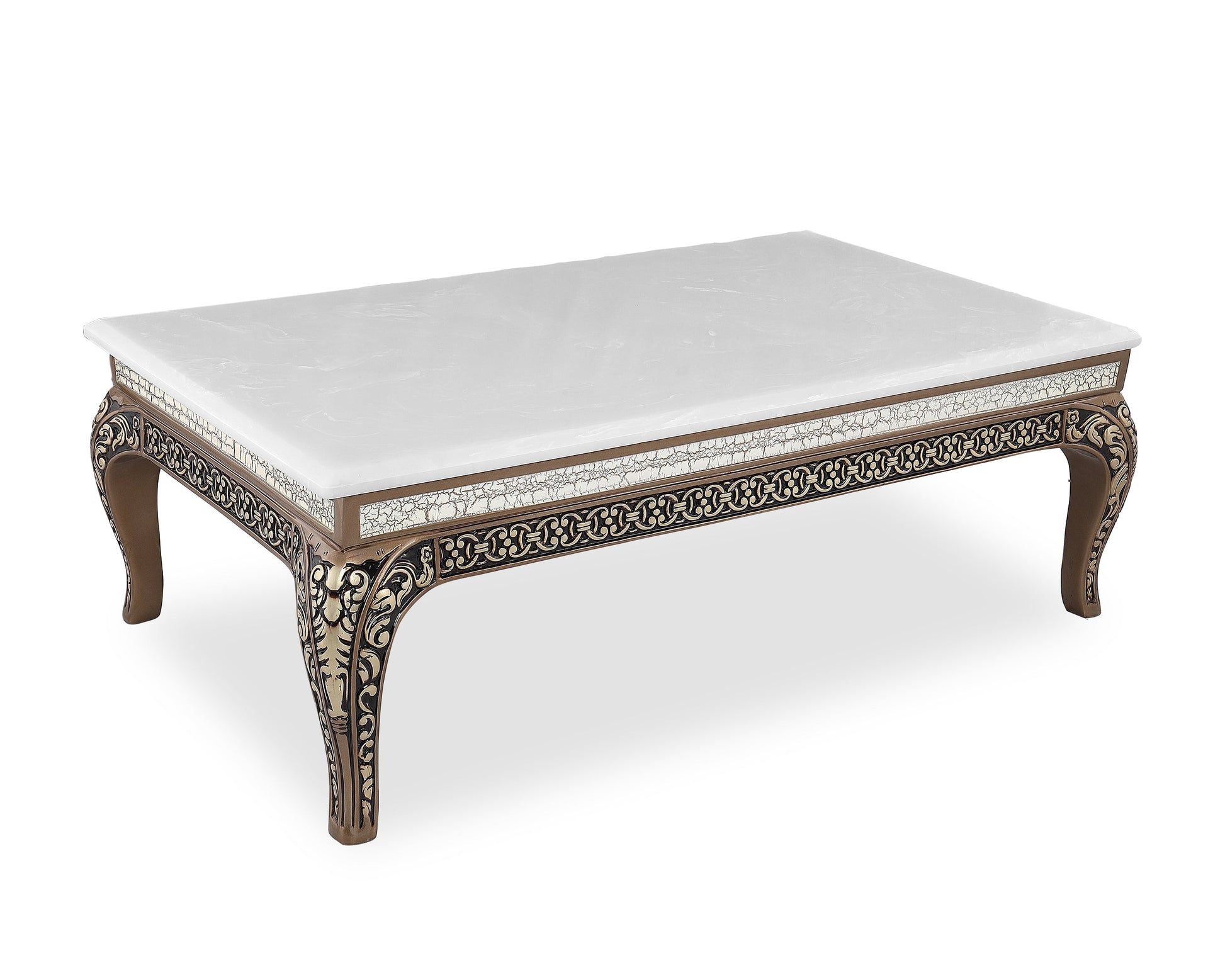 The DECCAN Center Table embodies the rich artistry of traditional Indian craftsmanship with a modern marble finish. Featuring a broad white marble top paired with an intricately carved base adorned with antique metallic highlights and crackle-textured mosaic inlays, this piece is a conversation starter for any living room. Its arched legs and pattern-framed edges offer an opulent and timeless aesthetic.