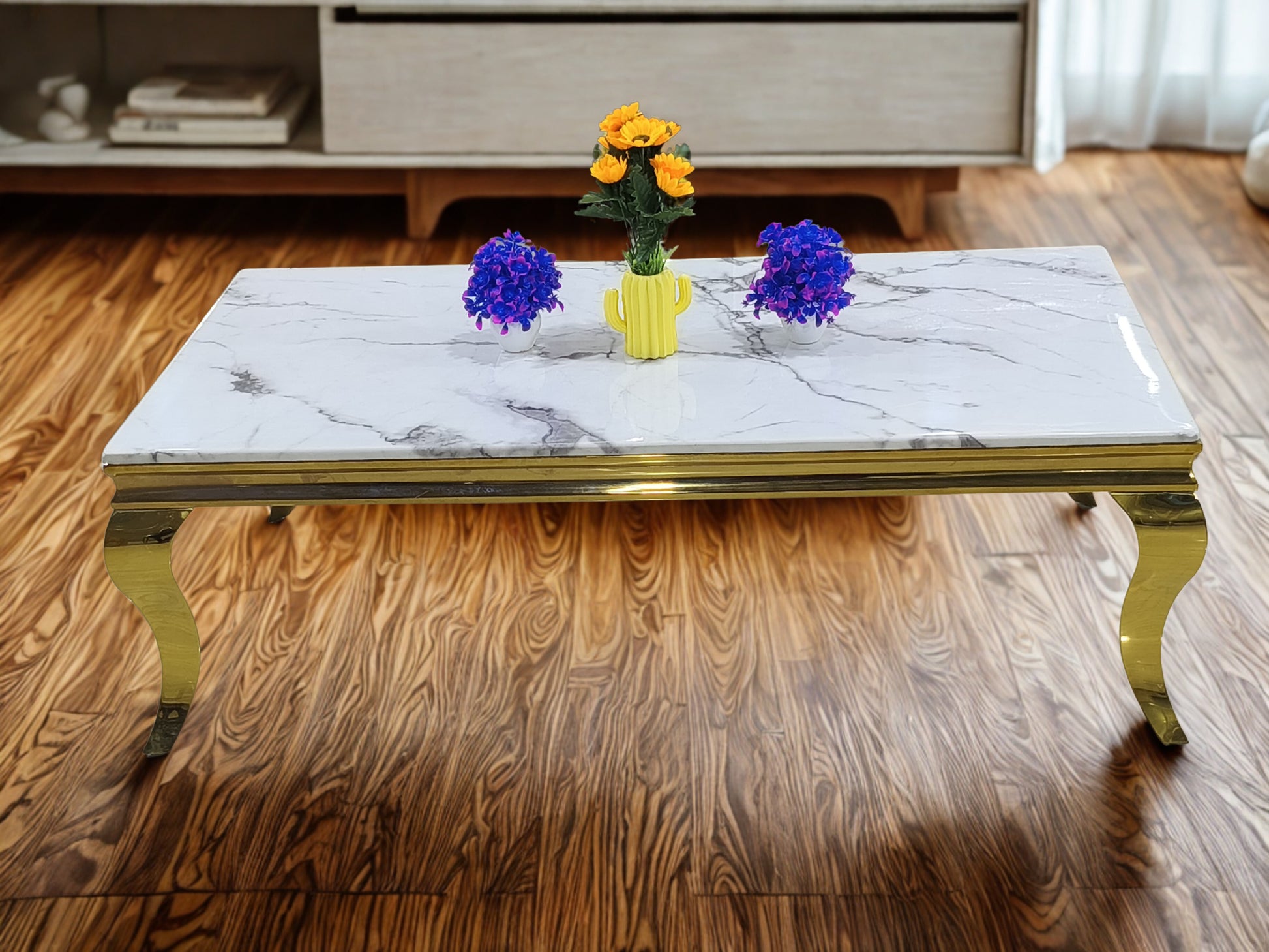 Add a touch of timeless elegance to your living room with Florence, a rectangular marble coffee table that blends classic curves with modern luxury. The white marble top with subtle grey veining pairs beautifully with the gold-finished stainless steel legs, creating a centerpiece that is both refined and durable. Perfect for traditional or contemporary spaces, this table brings sophistication to everyday living.