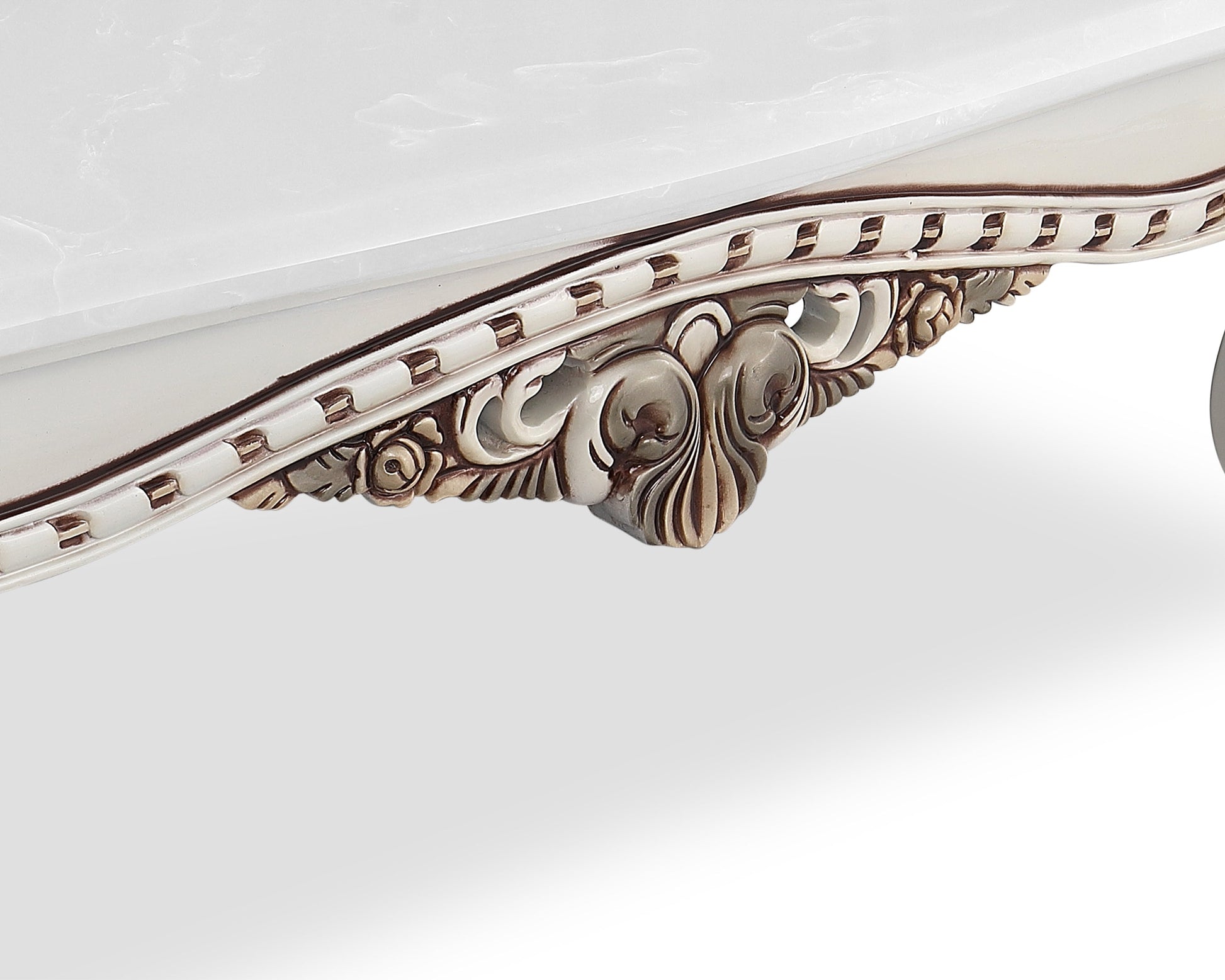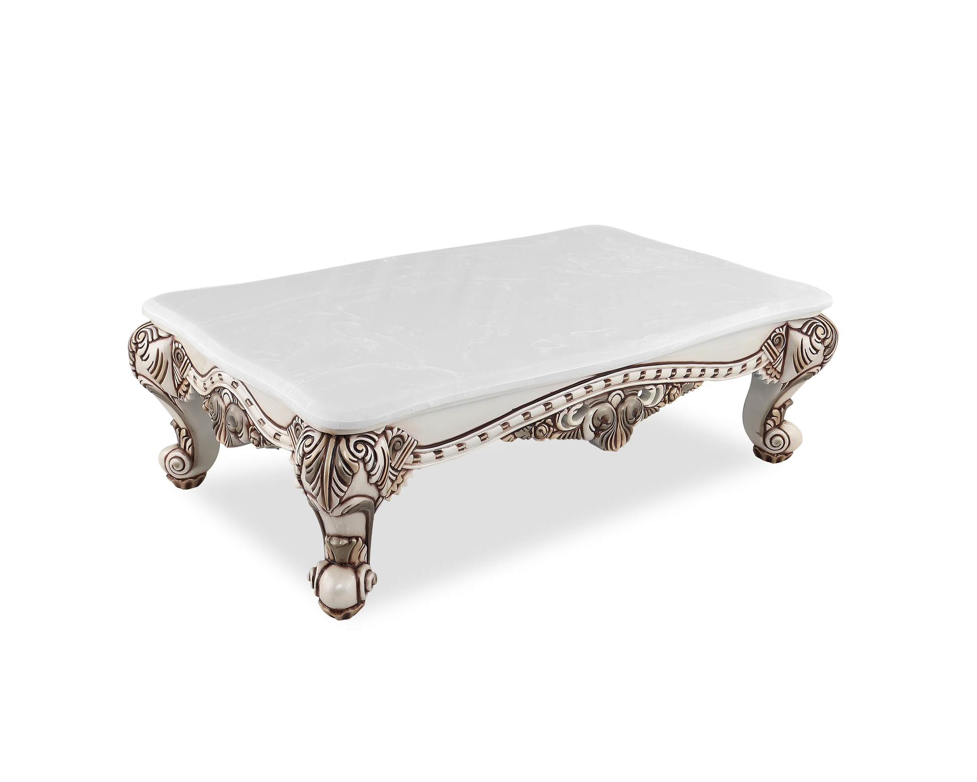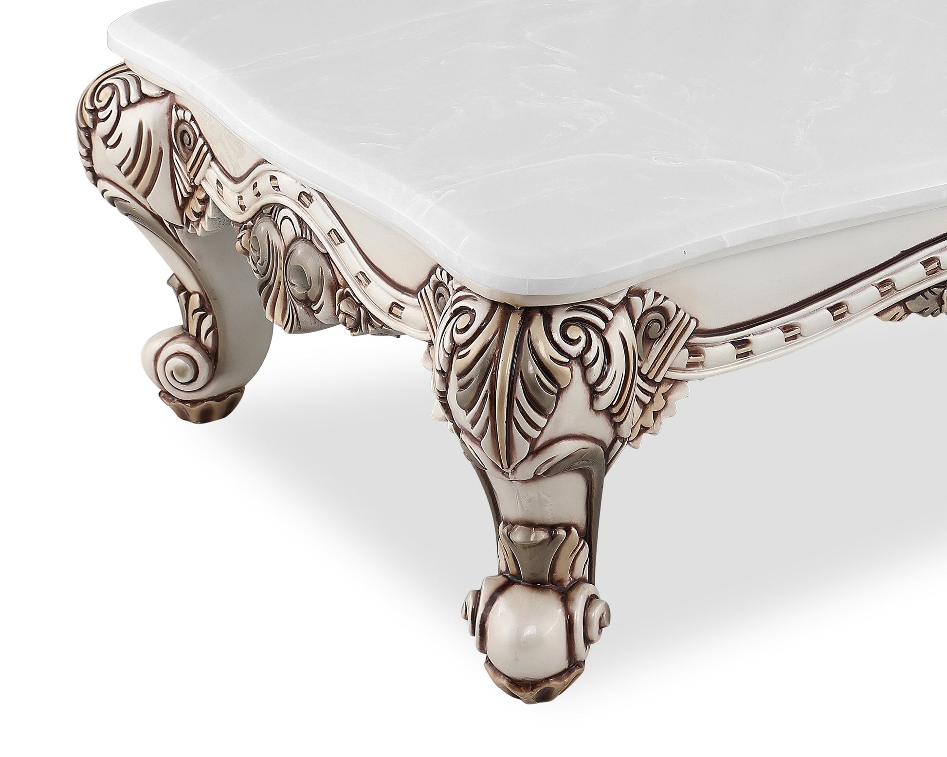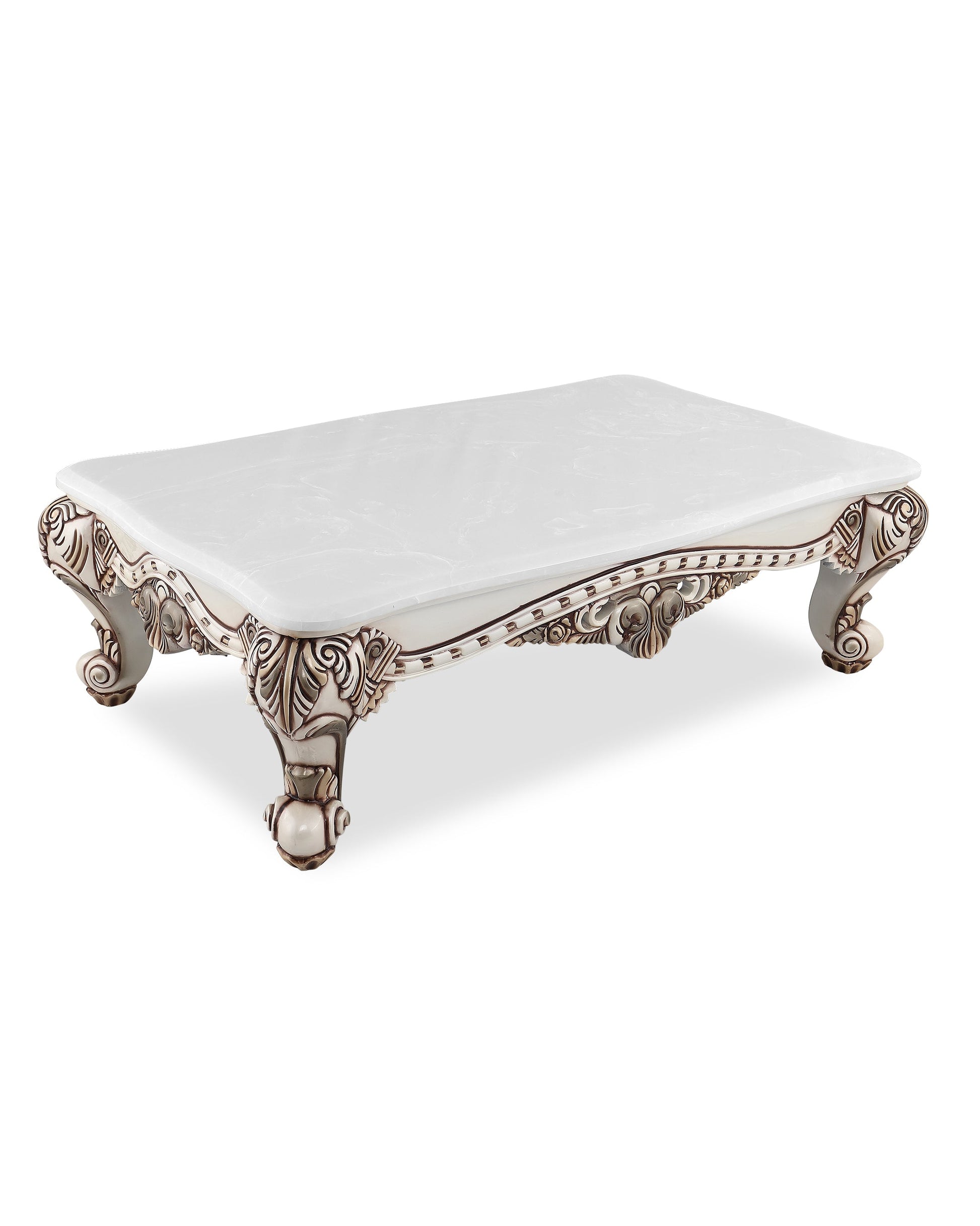 The HIND Center Table is a regal blend of Indian craftsmanship and European baroque influence. Crafted with precision, it features a rich white marble top resting on a hand-carved wooden frame with ornate scroll legs and floral detailing. Finished in an antique ivory-white palette with deep accents, this center table adds majestic elegance to any traditional living space.