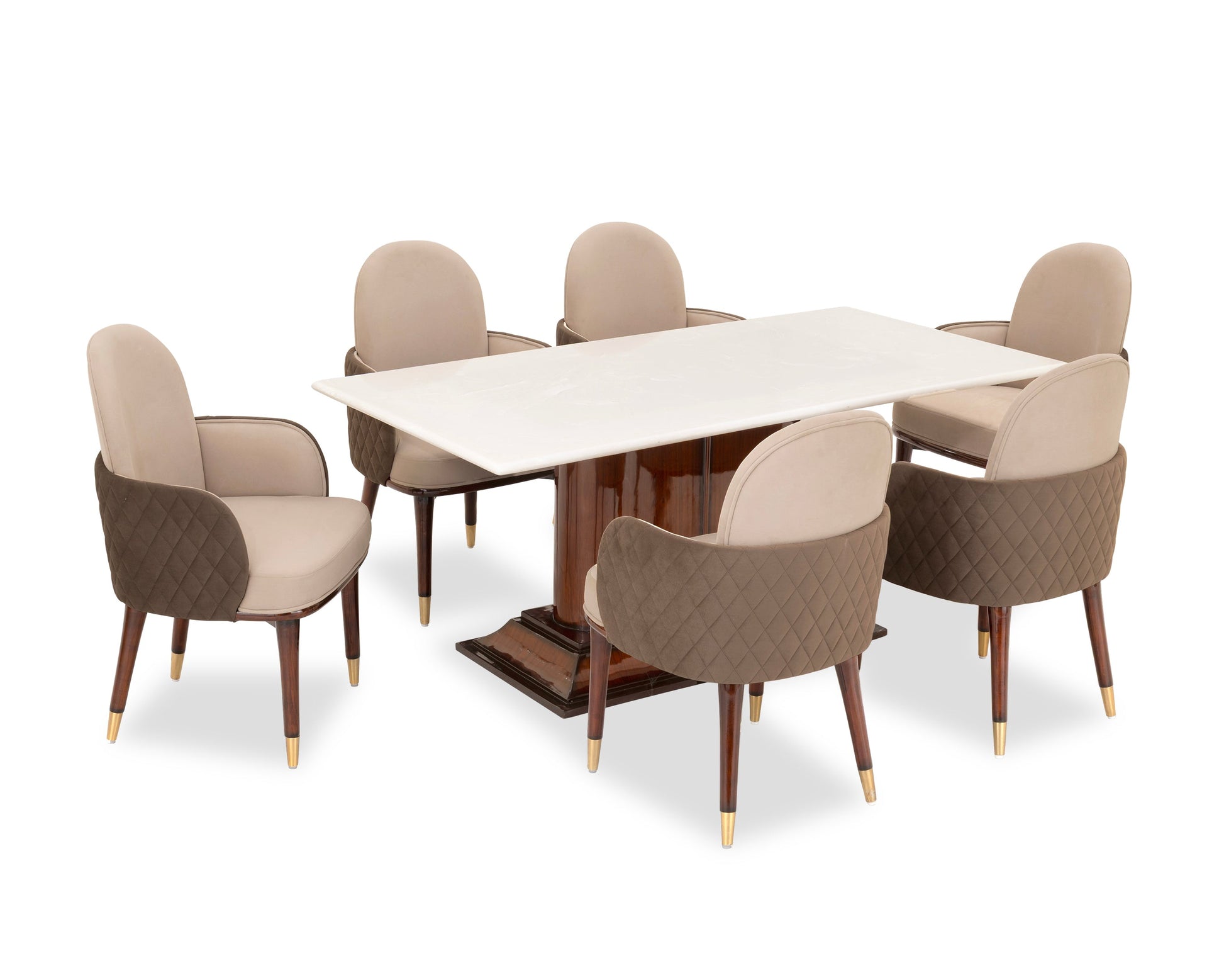 The INDUS Dining Set is a perfect blend of minimalist form and luxurious function. Designed with a sleek white marble tabletop and a high-gloss central pedestal base, this 6-seater arrangement offers both visual appeal and durable performance. The upholstered chairs feature a two-tone finish with quilted detailing, soft curved backs, and gold-tipped legs โ making every meal feel like a statement.