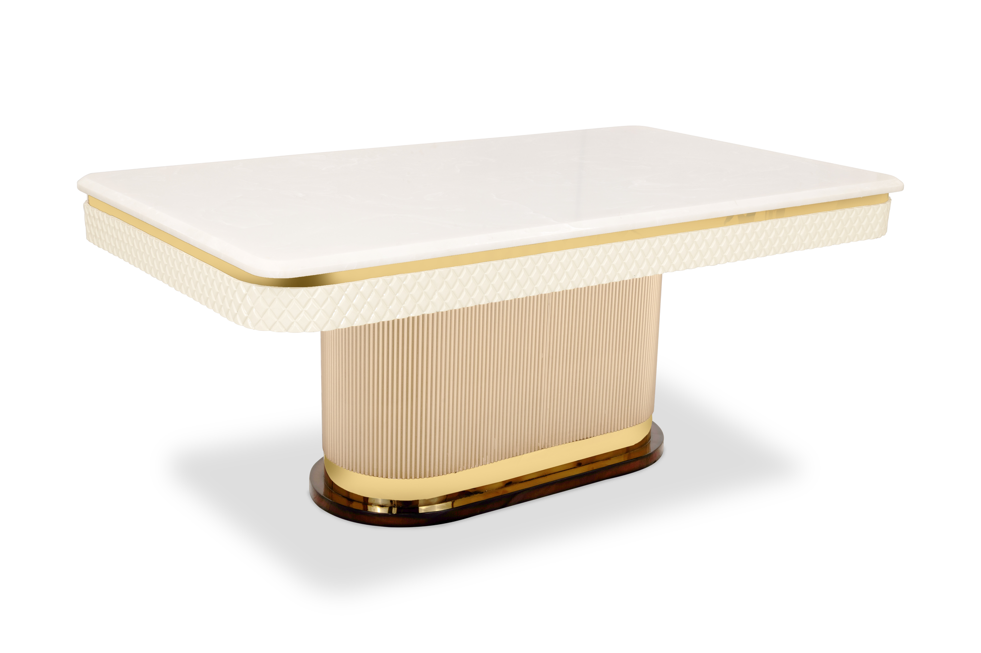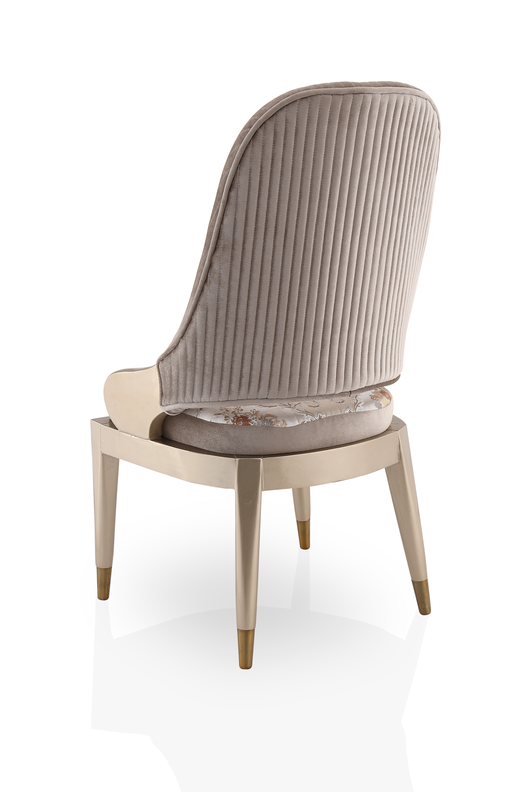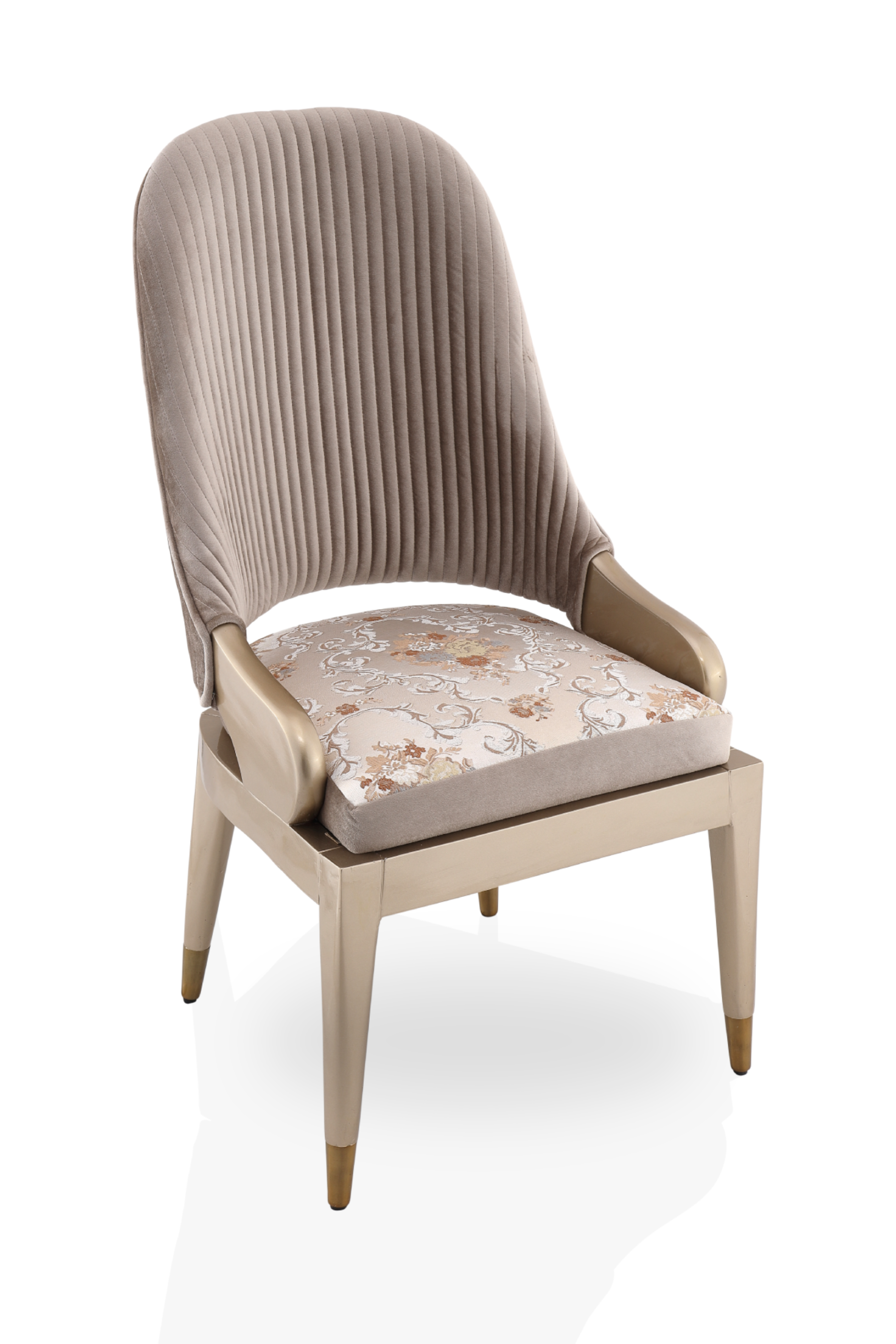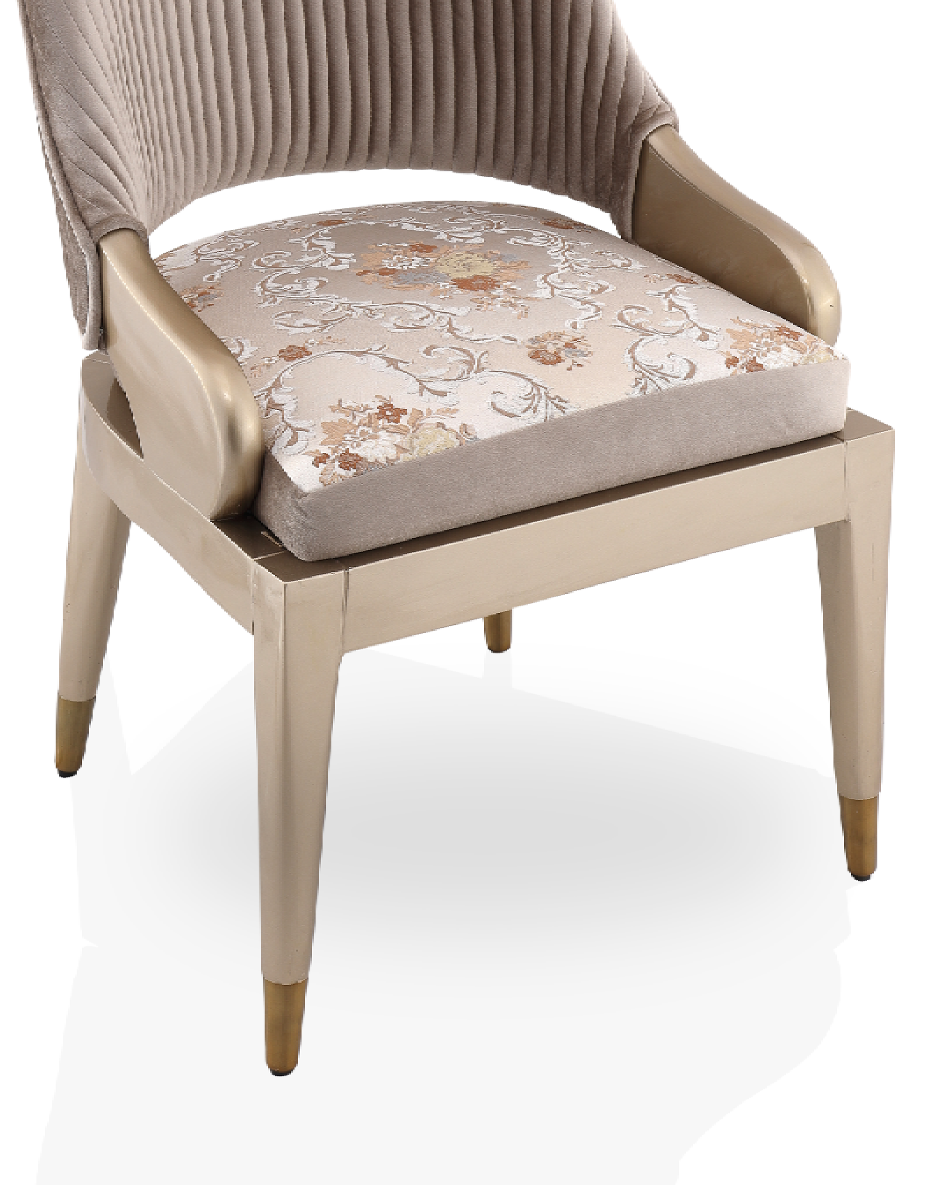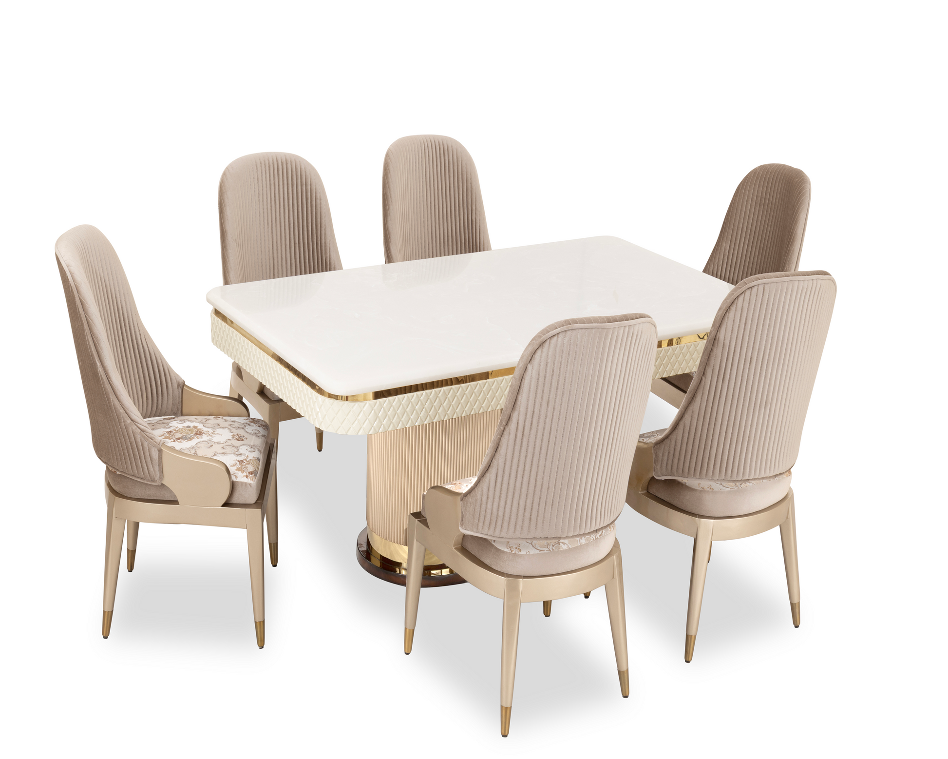 The JHELUM Dining Set is a refined fusion of soft textures and bold structure. Anchored by a pristine marble tabletop with curved edges and a fluted base, this 6-seater set brings a harmonious blend of modern and classic design. The high-back chairs are upholstered in rich velvet with vertical channel tufting and floral-accented seat cushions, exuding elegance with every detail.