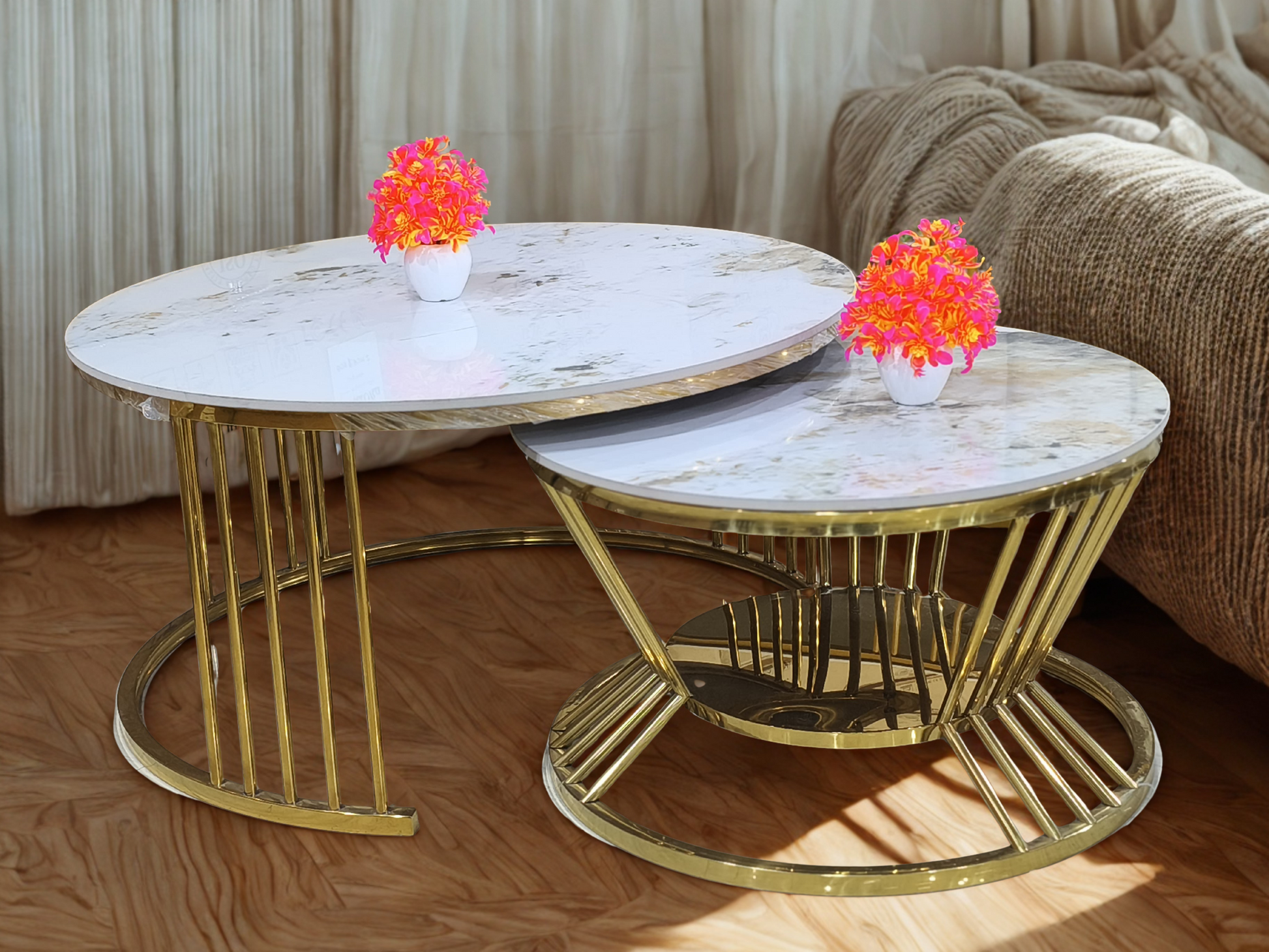 Add a touch of modern elegance to your living space with this set of round nesting marble coffee tables. Featuring premium marble tops and a striking gold stainless steel frame, these tables bring both style and versatility to your home. The nesting design allows you to use them together as a centerpiece or separately for extra surface space when entertaining