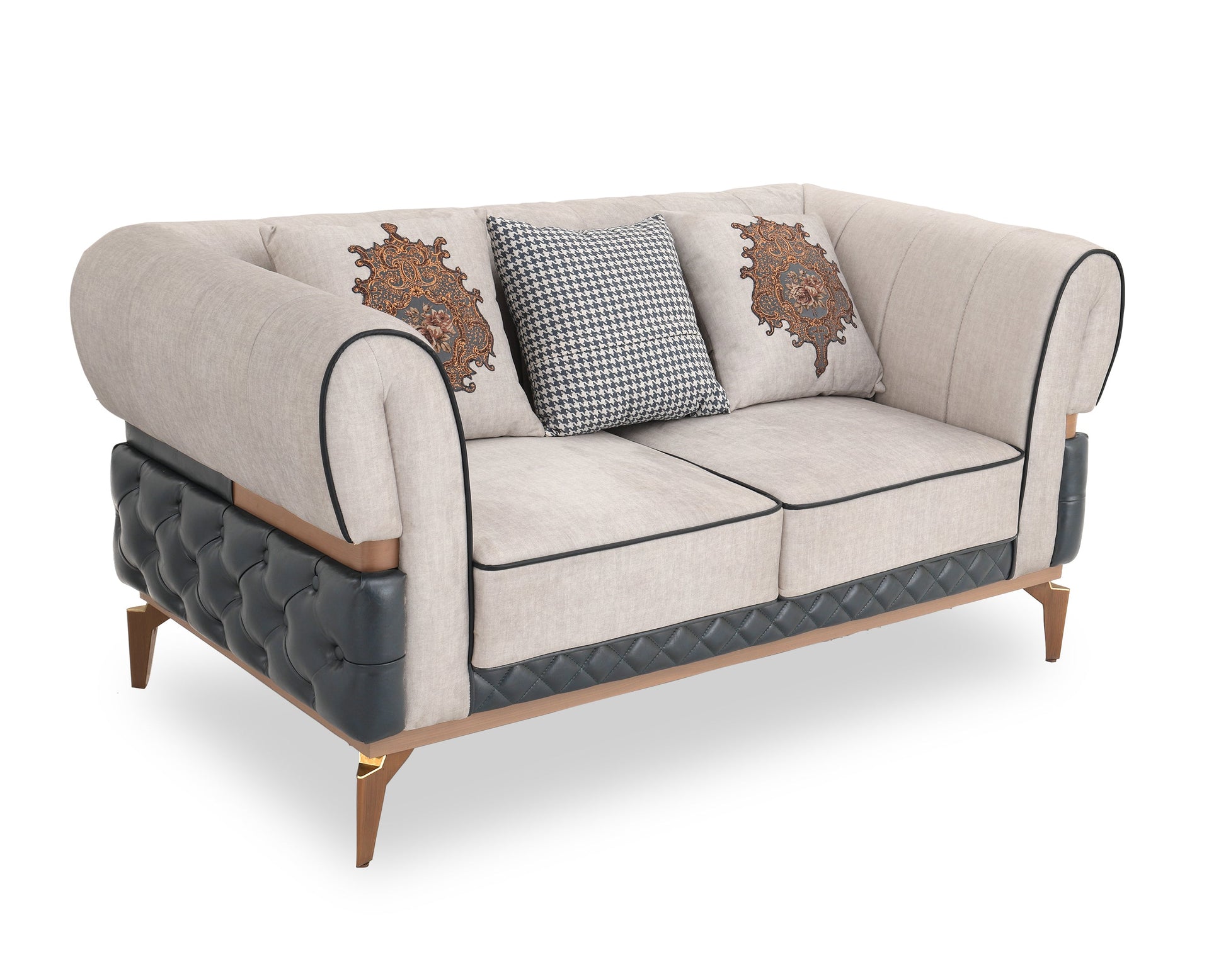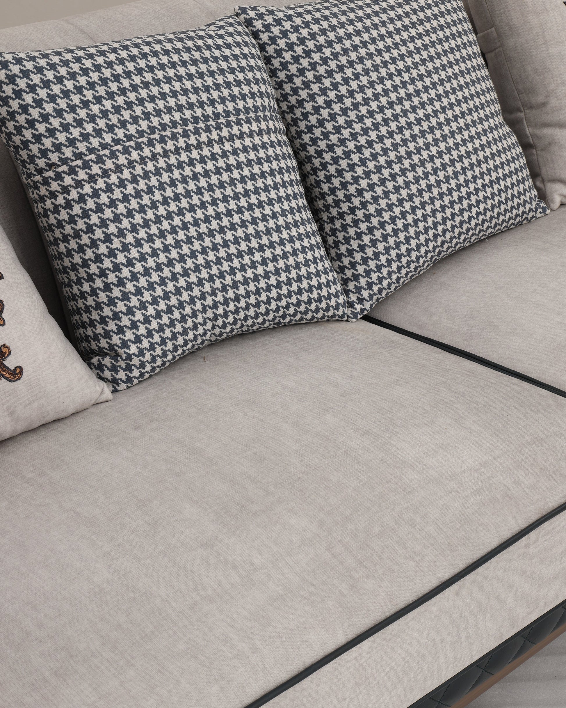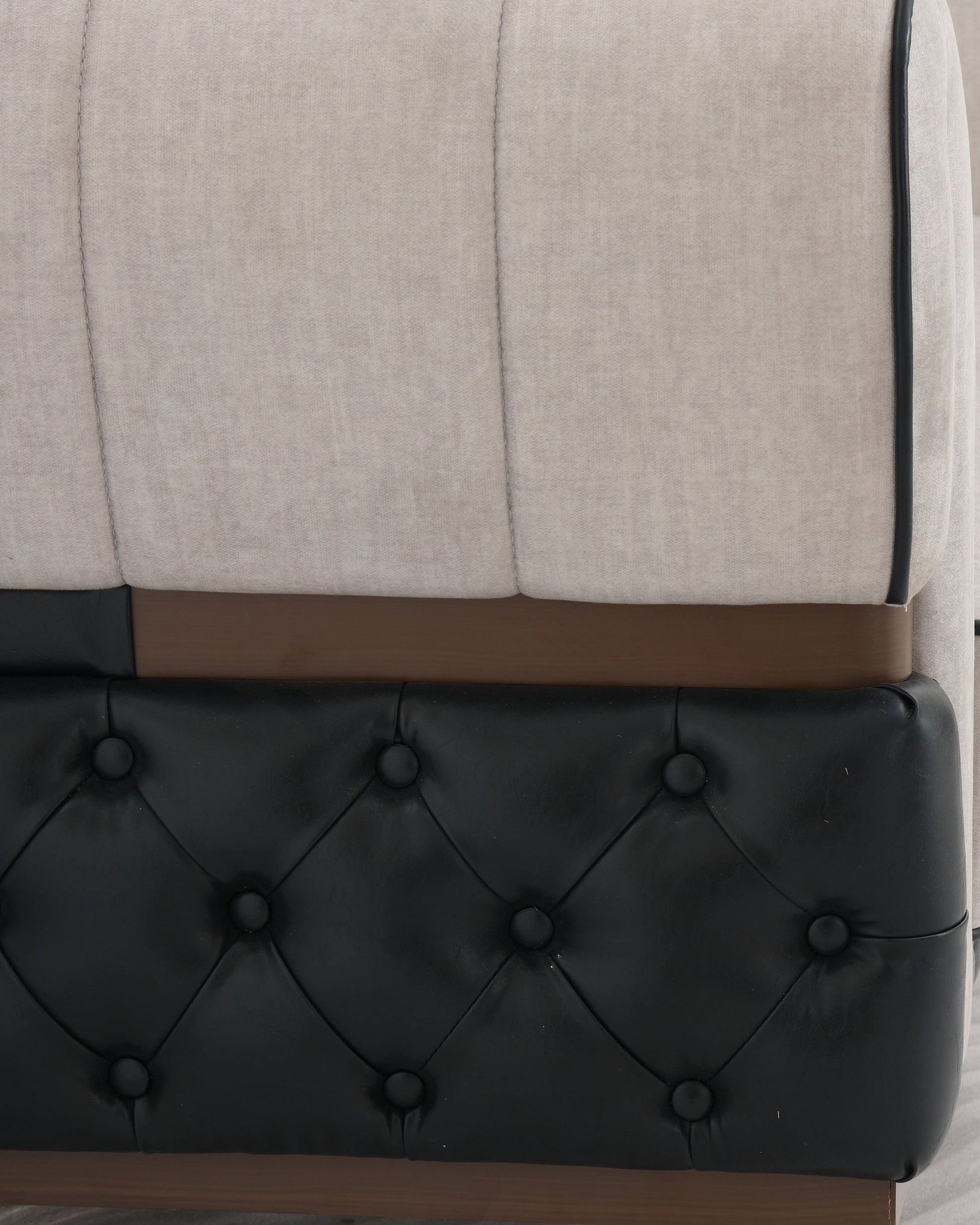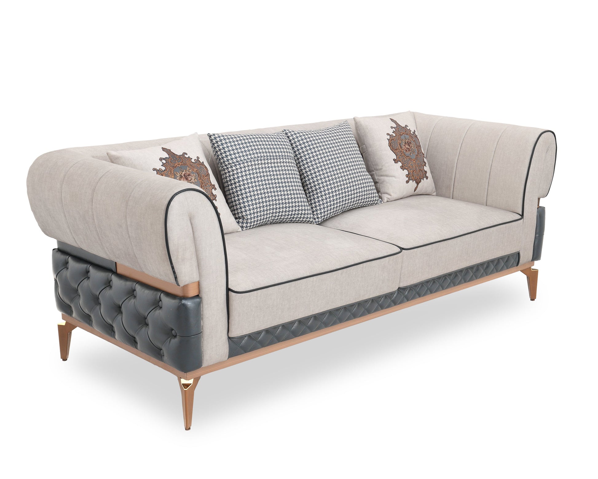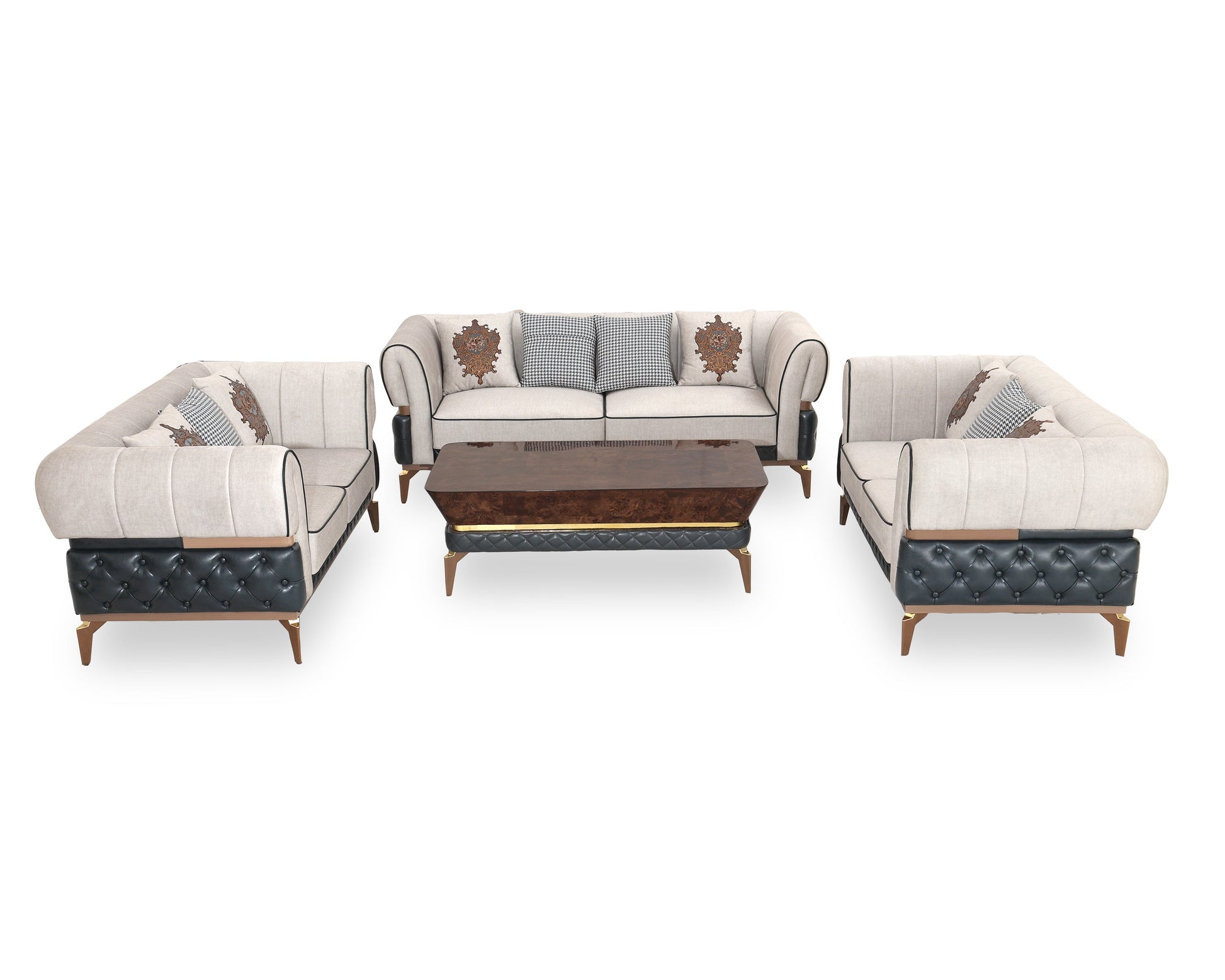 Bring timeless elegance into your living space with this exquisitely crafted premium sofa set. Featuring a harmonious blend of plush beige fabric and rich diamond-quilted black leatherette base, this set is designed to impress. The intricate carved detailing on the cushions adds a touch of royal charm, while the ergonomic backrest and deep seating provide unmatched comfort. Whether entertaining guests or relaxing with family, this 3+2+2 seater arrangement and matching center table offer both luxury and functionality. The golden-tipped legs and dual-tone upholstery lend a modern classic look that fits beautifully in both traditional and contemporary interiors.