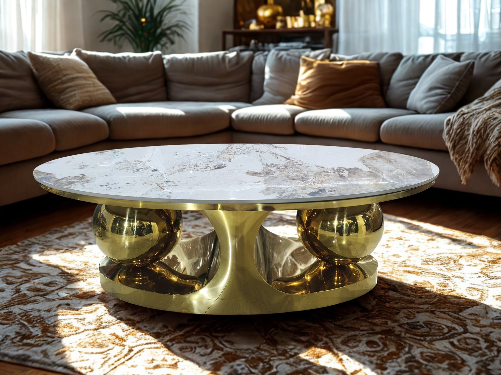 Make a bold statement in your living room with this luxury round marble coffee table. Featuring a premium marble top and a unique golden sphere base, this piece combines elegance, artistry, and modern design. The sculptural base with glossy golden spheres adds a striking focal point, making this table as much a conversation piece as it is functional furniture.