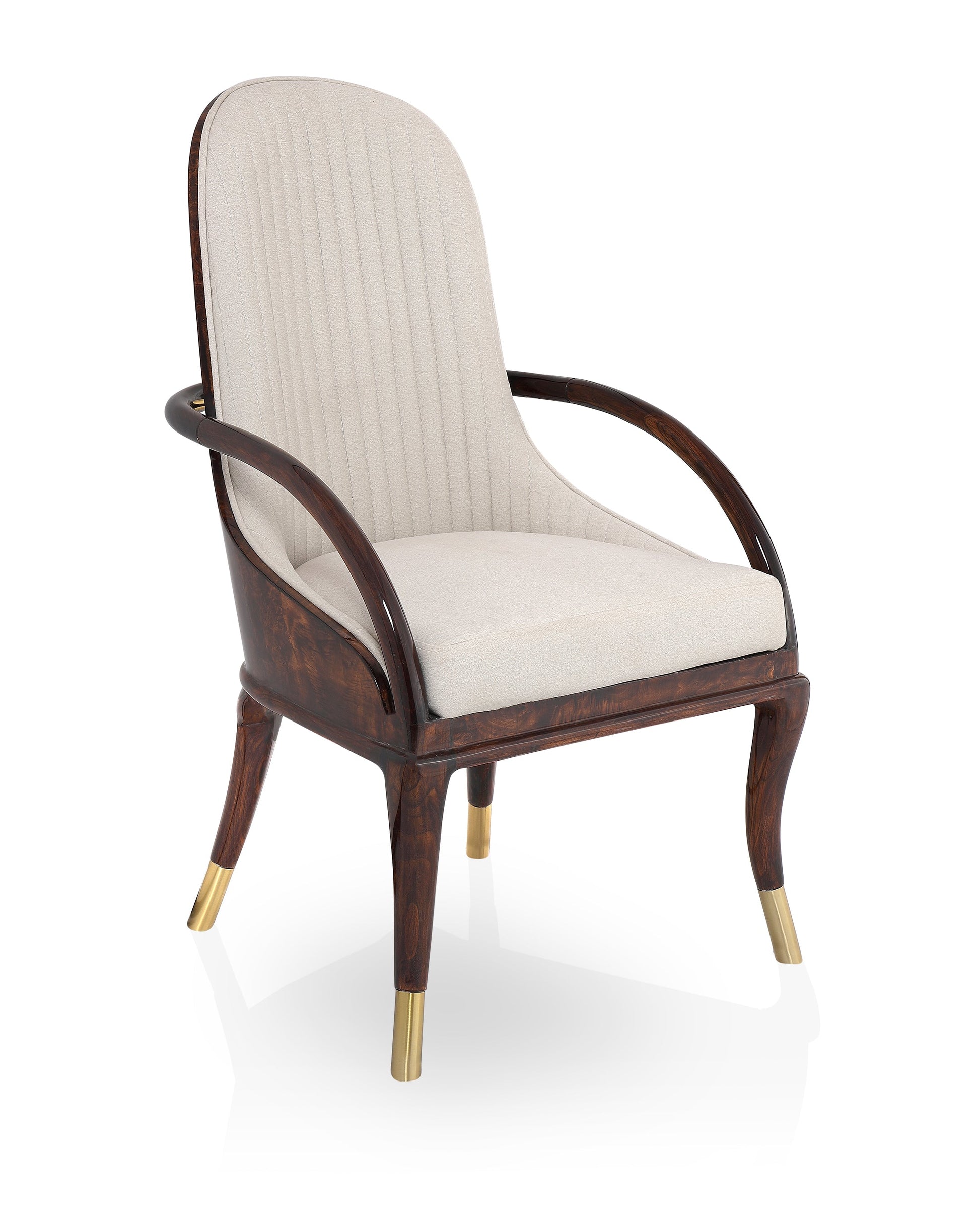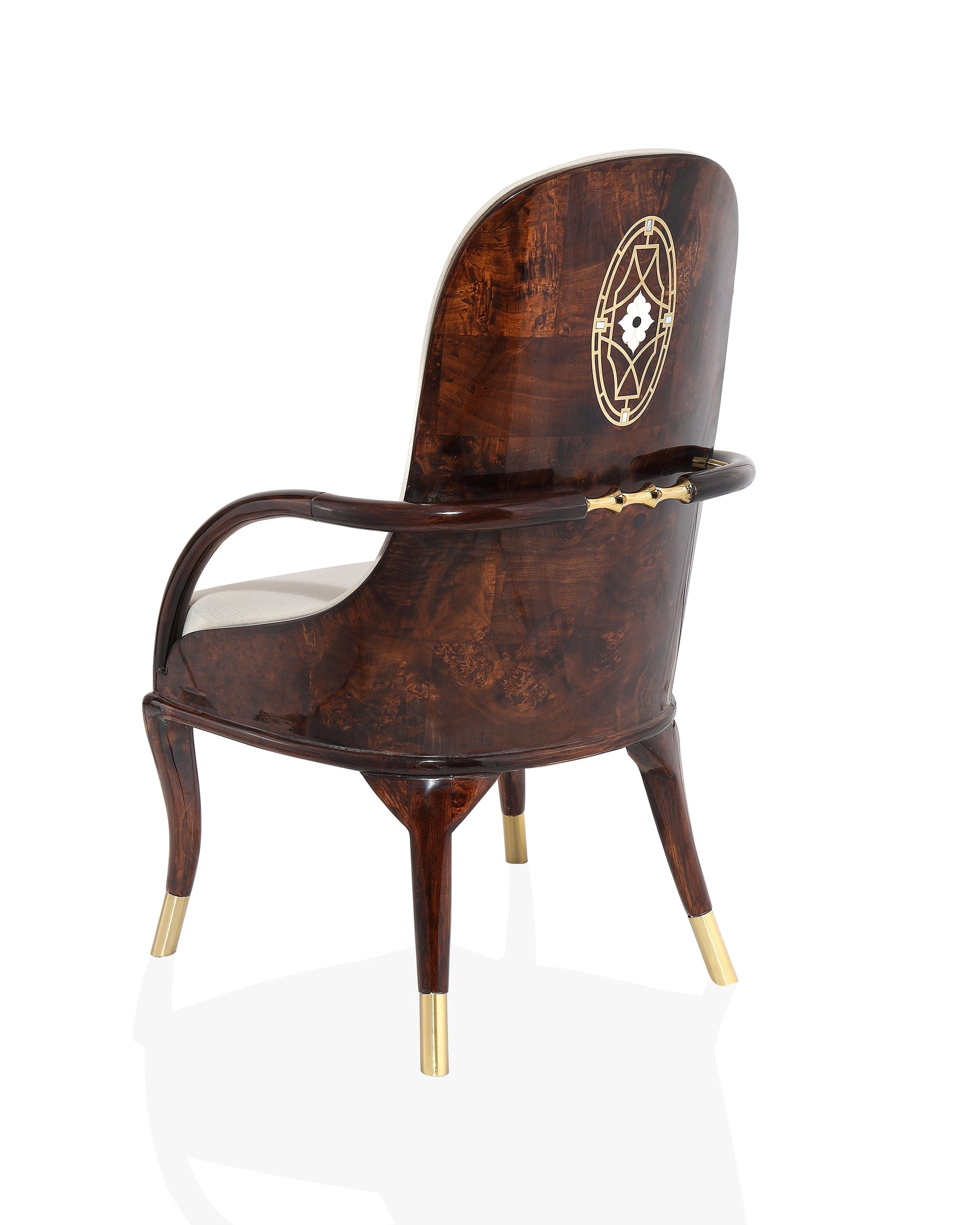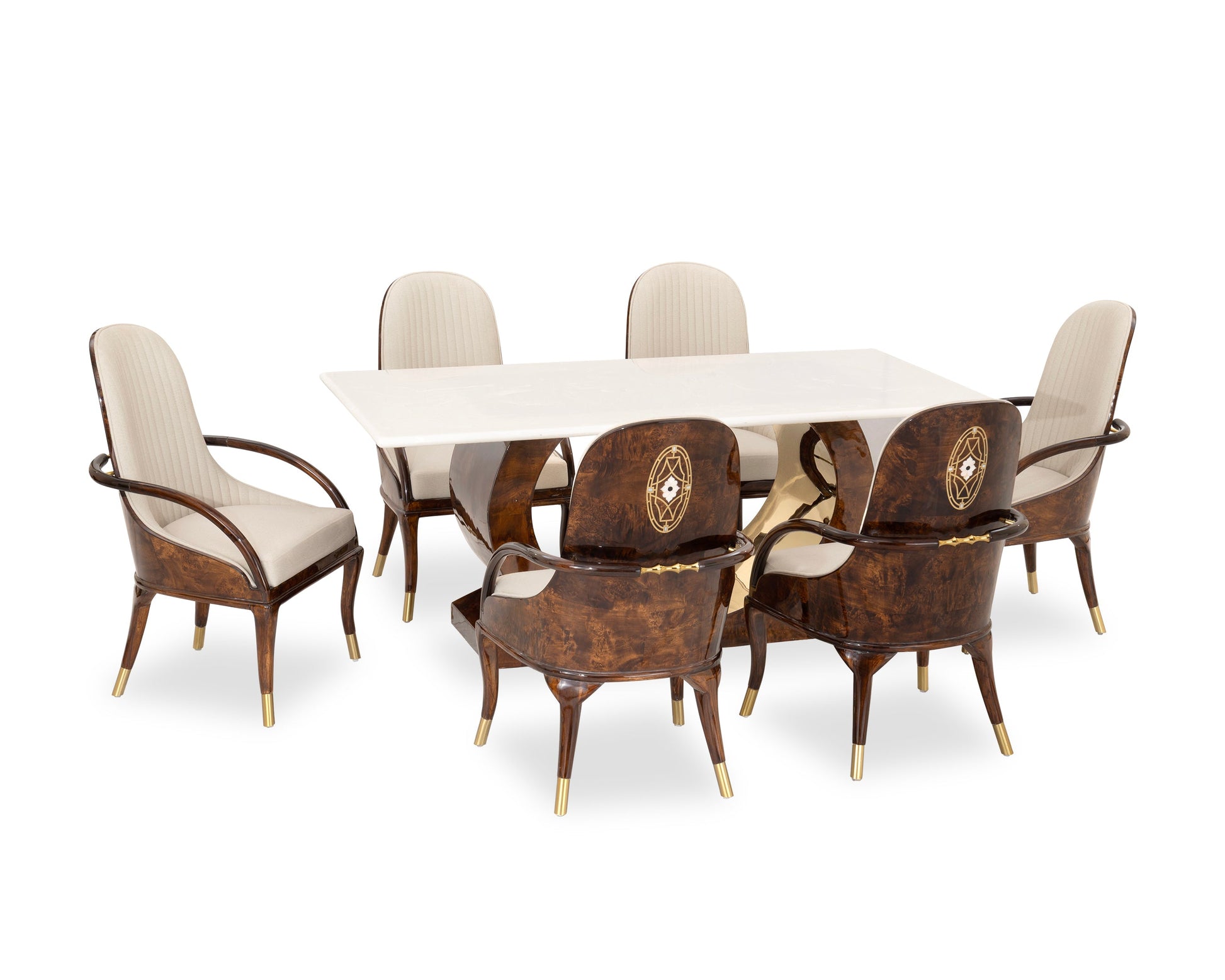 The rectangular dining table features a striking marble-finish top, supported by a beautifully contoured base that enhances its sculptural appeal. The standout feature lies in the chairs — crafted from rich, high-gloss burl wood, adorned with intricate gold inlay detailing on the backrests, and fitted with soft beige upholstery for an inviting seating experience. Gold-capped legs and curved wooden armrests complete the lavish design, making PALOMA a stunning centerpiece for any home.