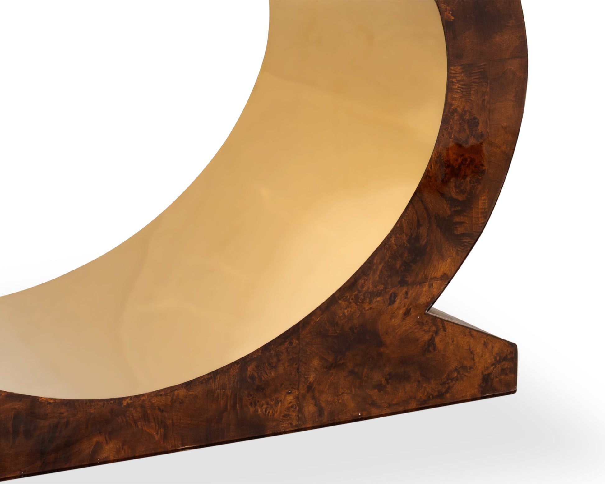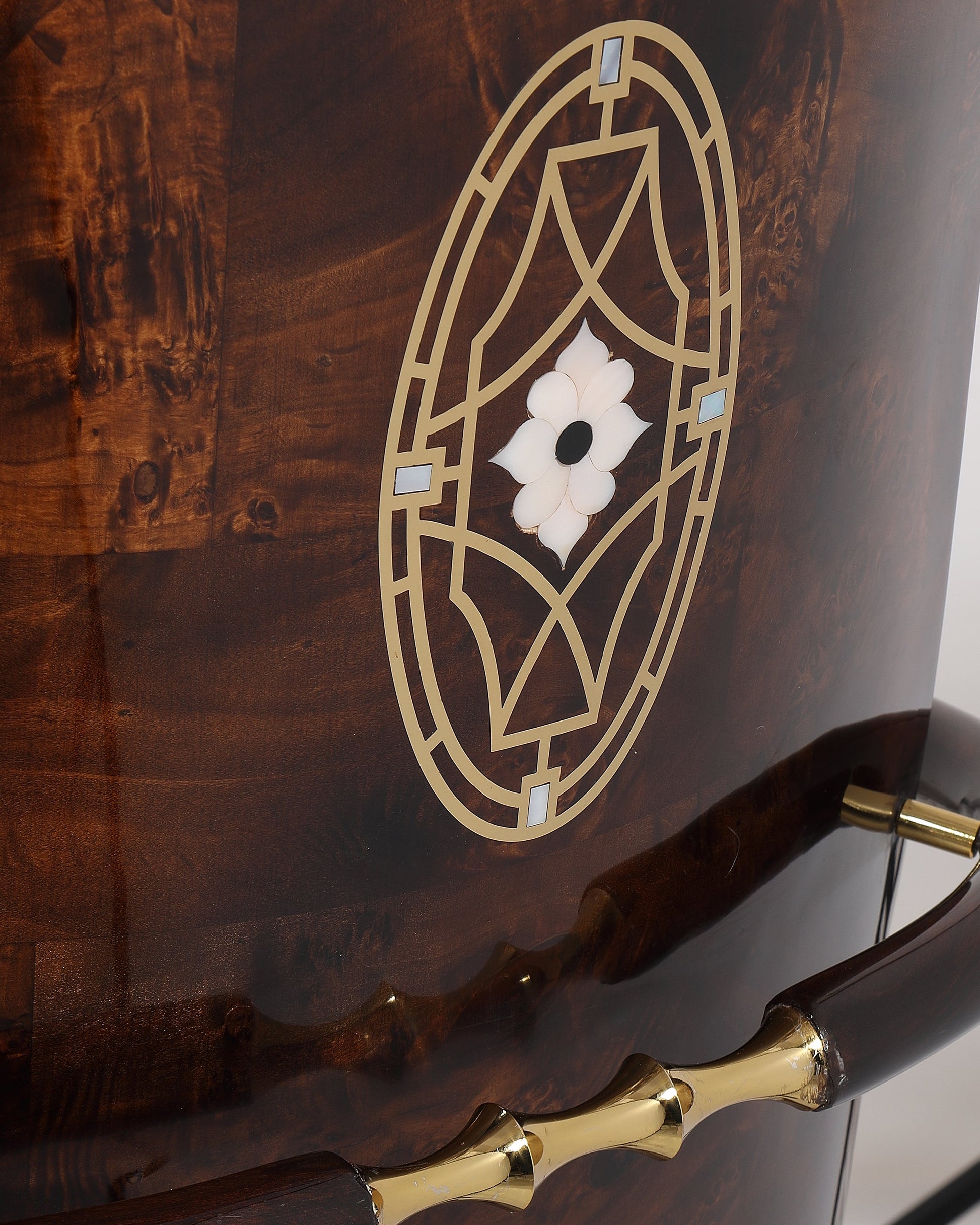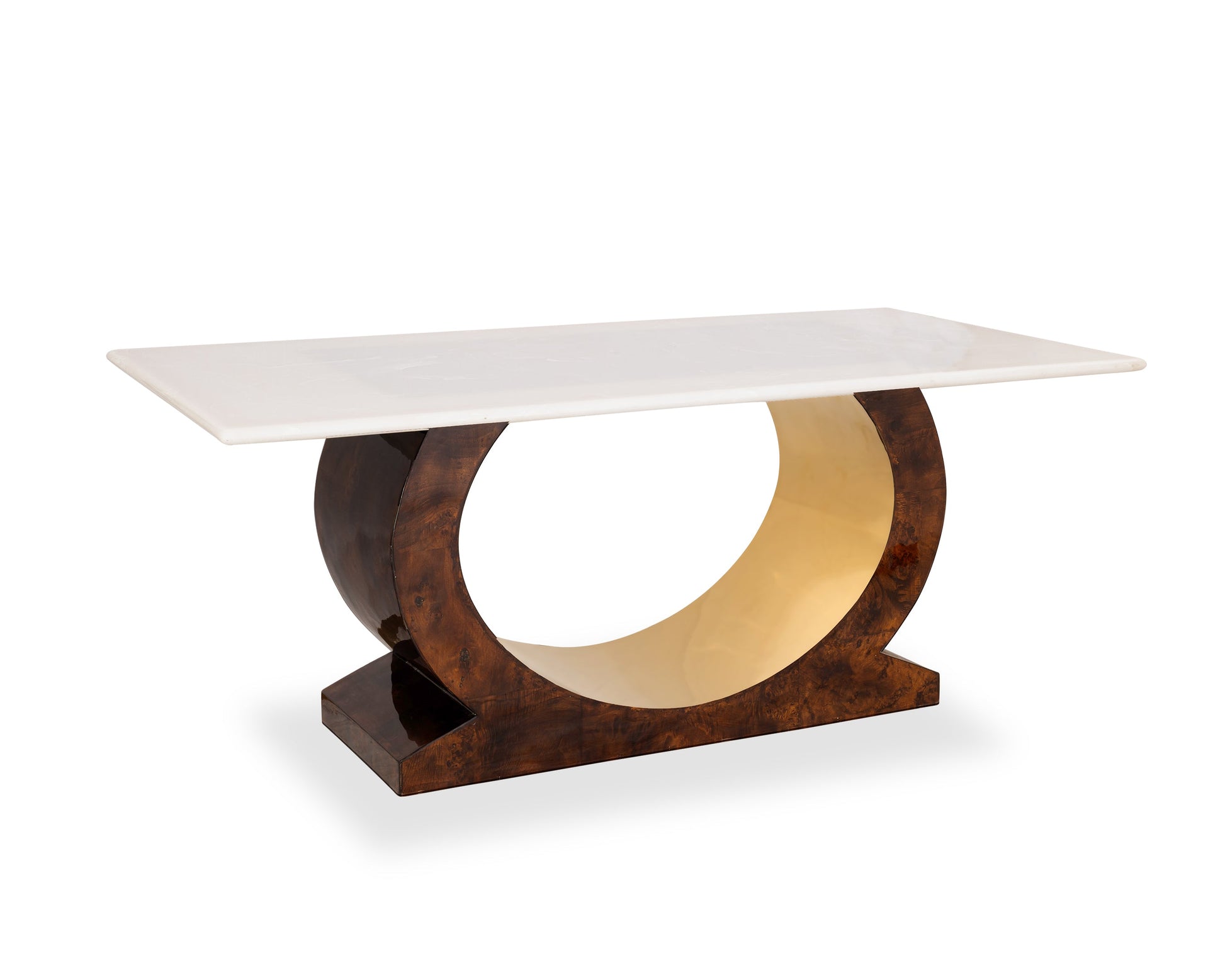 The rectangular dining table features a striking marble-finish top, supported by a beautifully contoured base that enhances its sculptural appeal. The standout feature lies in the chairs — crafted from rich, high-gloss burl wood, adorned with intricate gold inlay detailing on the backrests, and fitted with soft beige upholstery for an inviting seating experience. Gold-capped legs and curved wooden armrests complete the lavish design, making PALOMA a stunning centerpiece for any home.