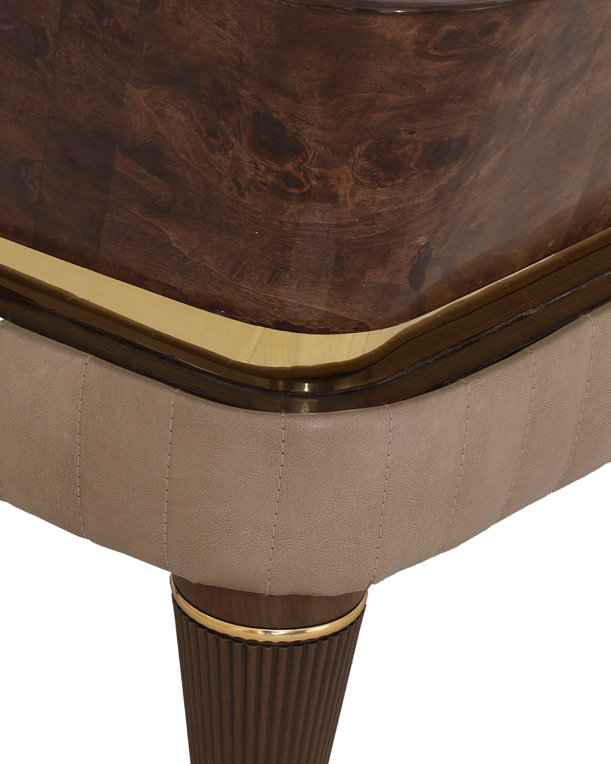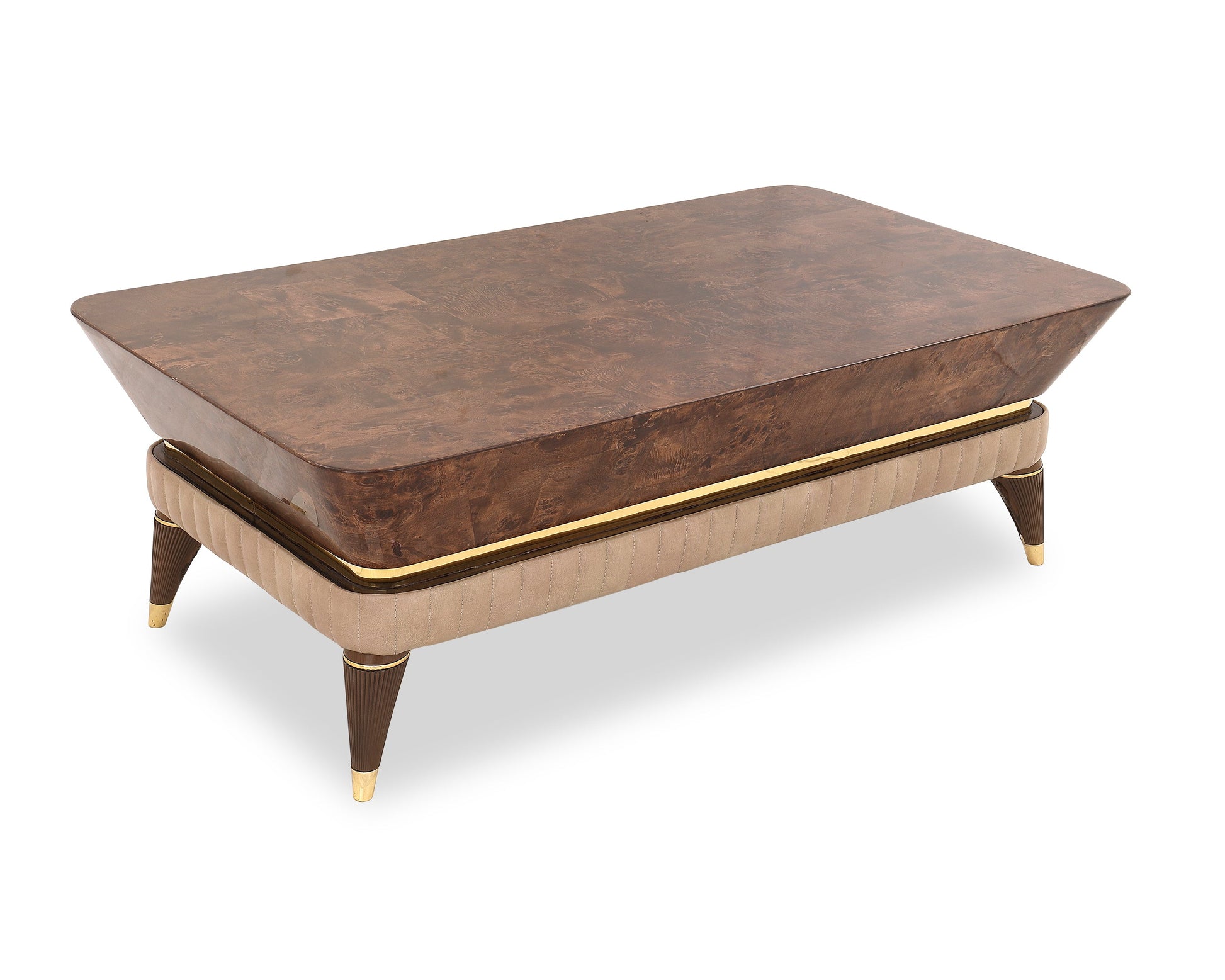 The REGAL Center Table lives up to its name — an epitome of tasteful grandeur. Designed with a stunning walnut-brown wooden top, subtly tapered legs with golden accents, and a soft fabric-textured base, it strikes the perfect balance between opulence and modern style. Ideal for sophisticated living rooms that demand attention.