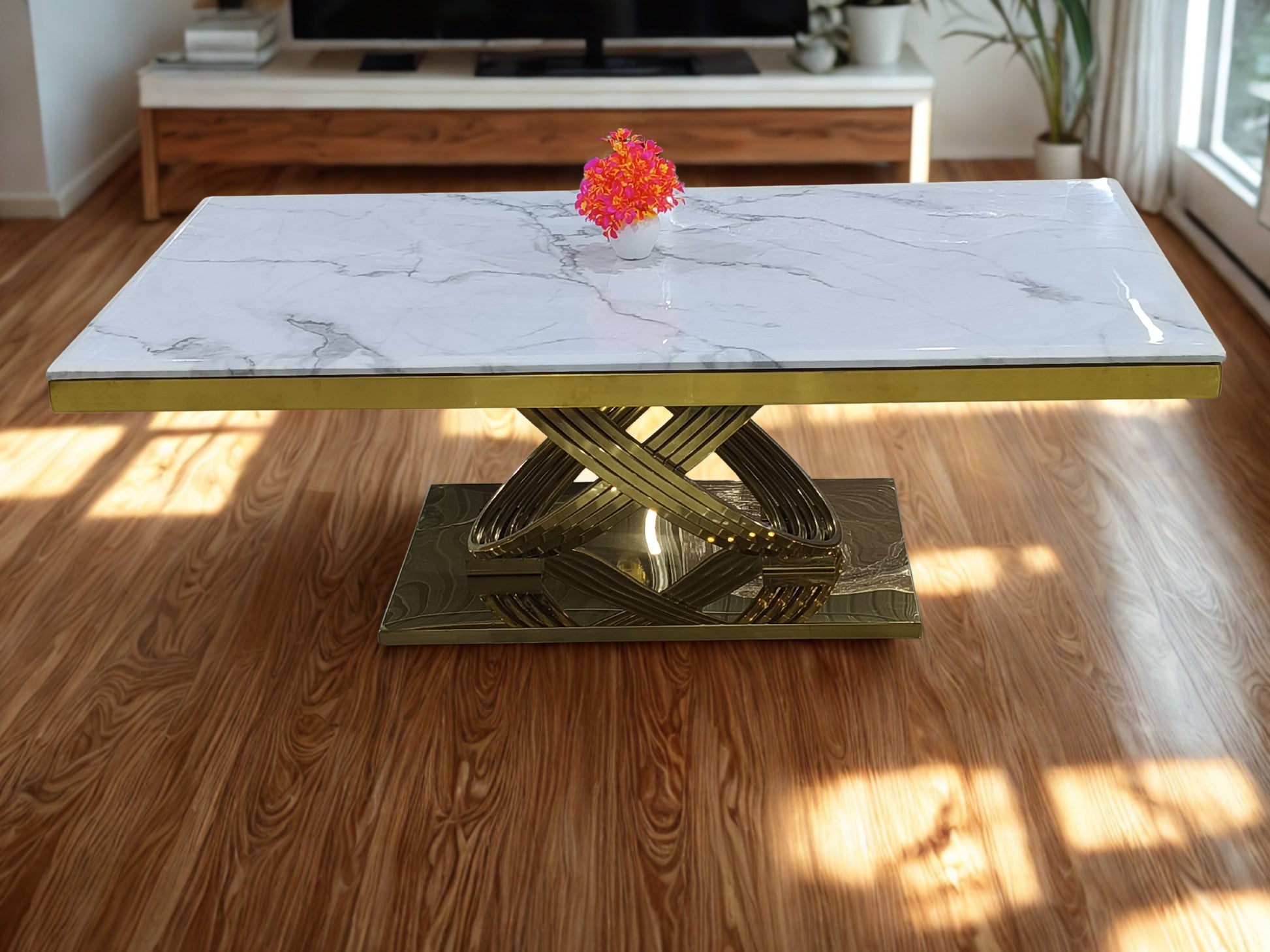 Elevate your living space with this luxurious marble-top center table that blends timeless elegance with modern design. The sleek white marble surface with natural grey veining adds sophistication, while the bold golden intertwined base creates a striking statement piece. Perfect as a centerpiece for your living room, this table combines style, durability, and functionality.