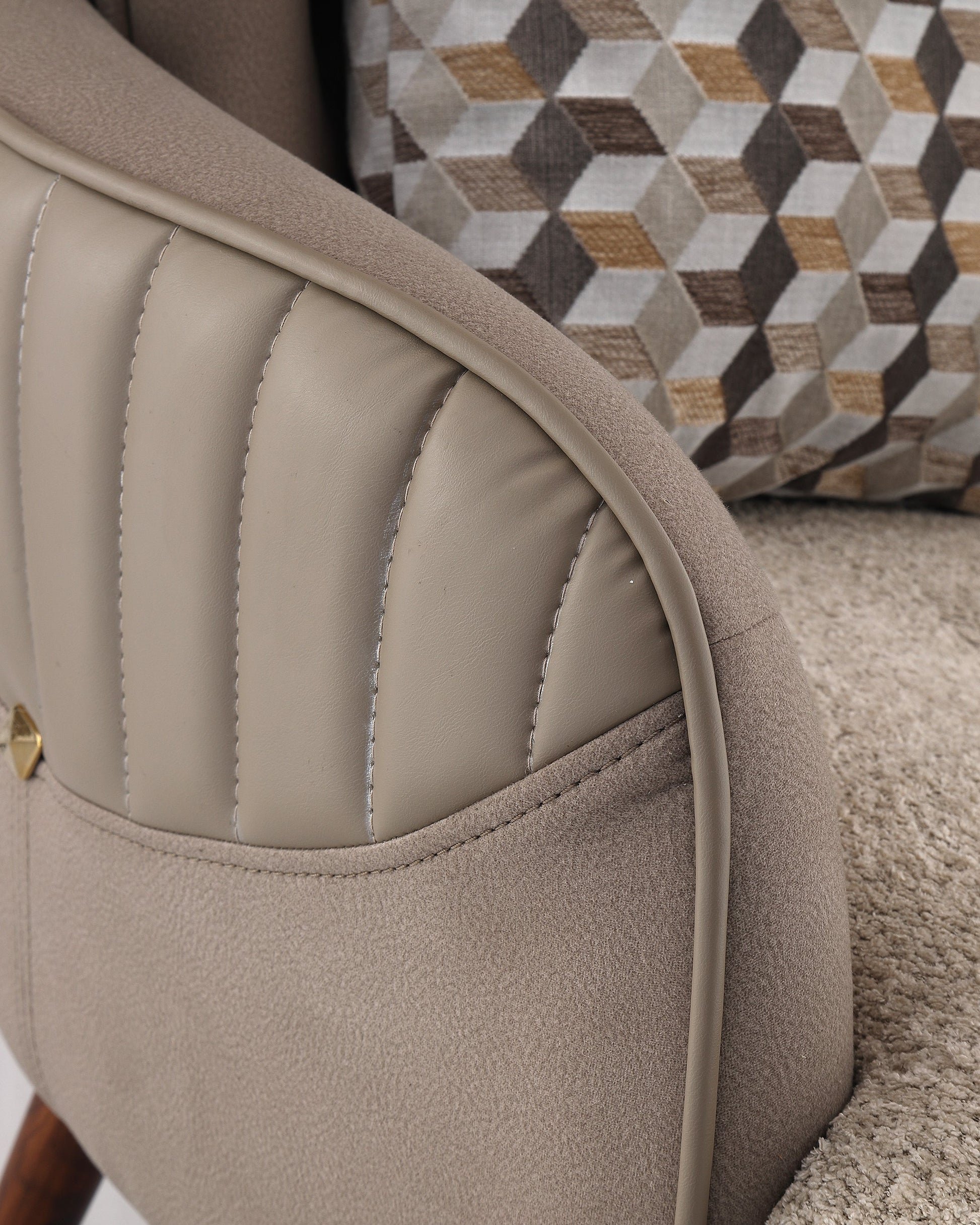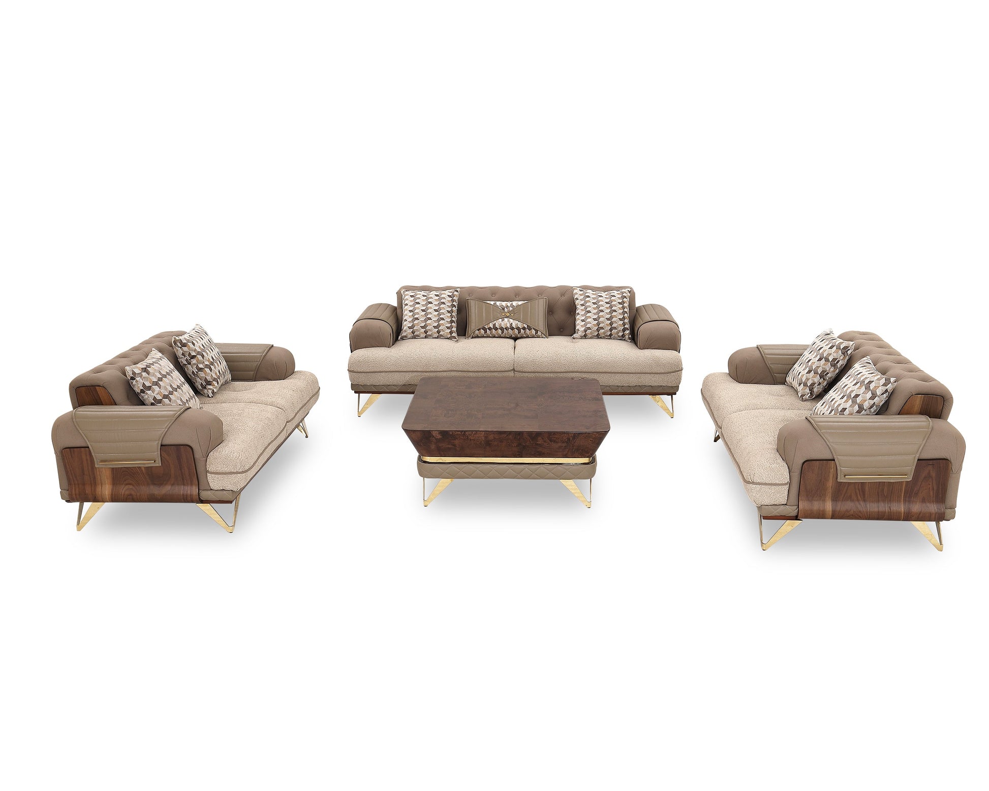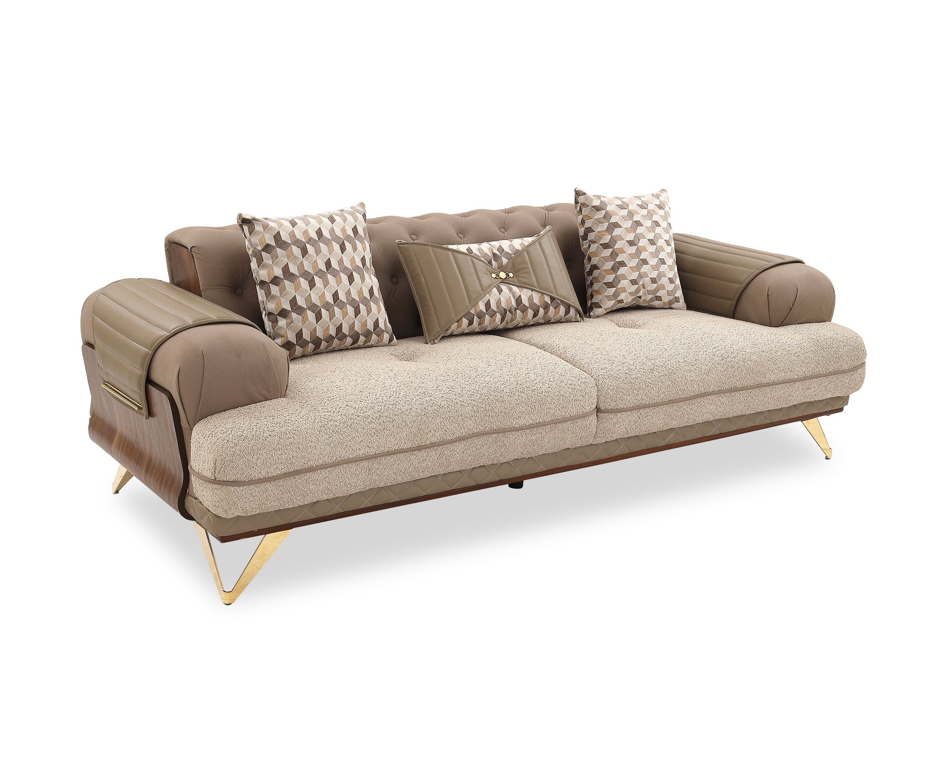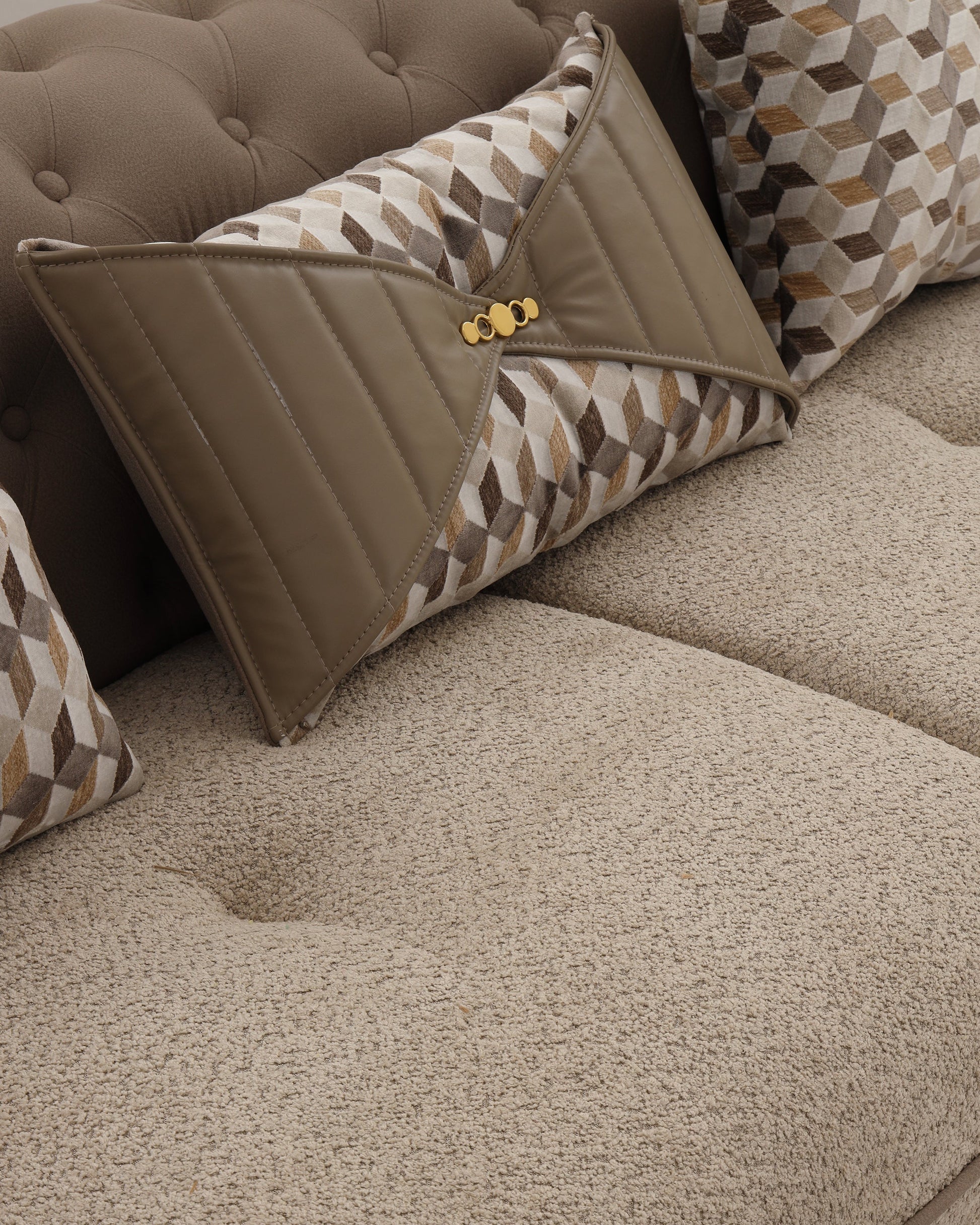 The REGENT Sofa Set is a fusion of modern elegance and functional luxury. Wrapped in a warm beige fabric and detailed with eye-catching gold metal trims, REGENT balances clean lines with plush comfort. Its structured build, geometric printed cushions, and wide seating make it the perfect companion for a stylish and inviting living space.