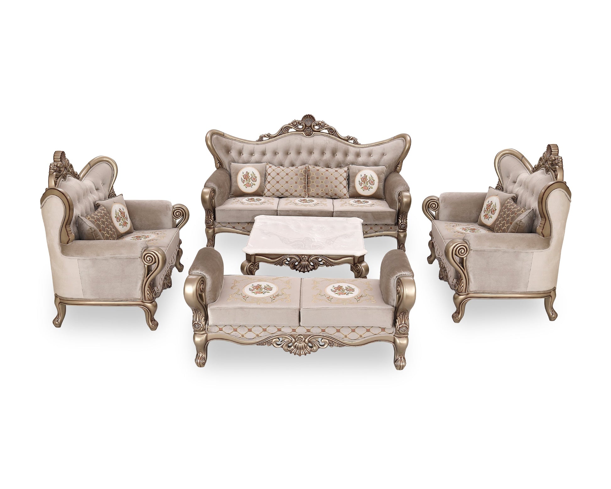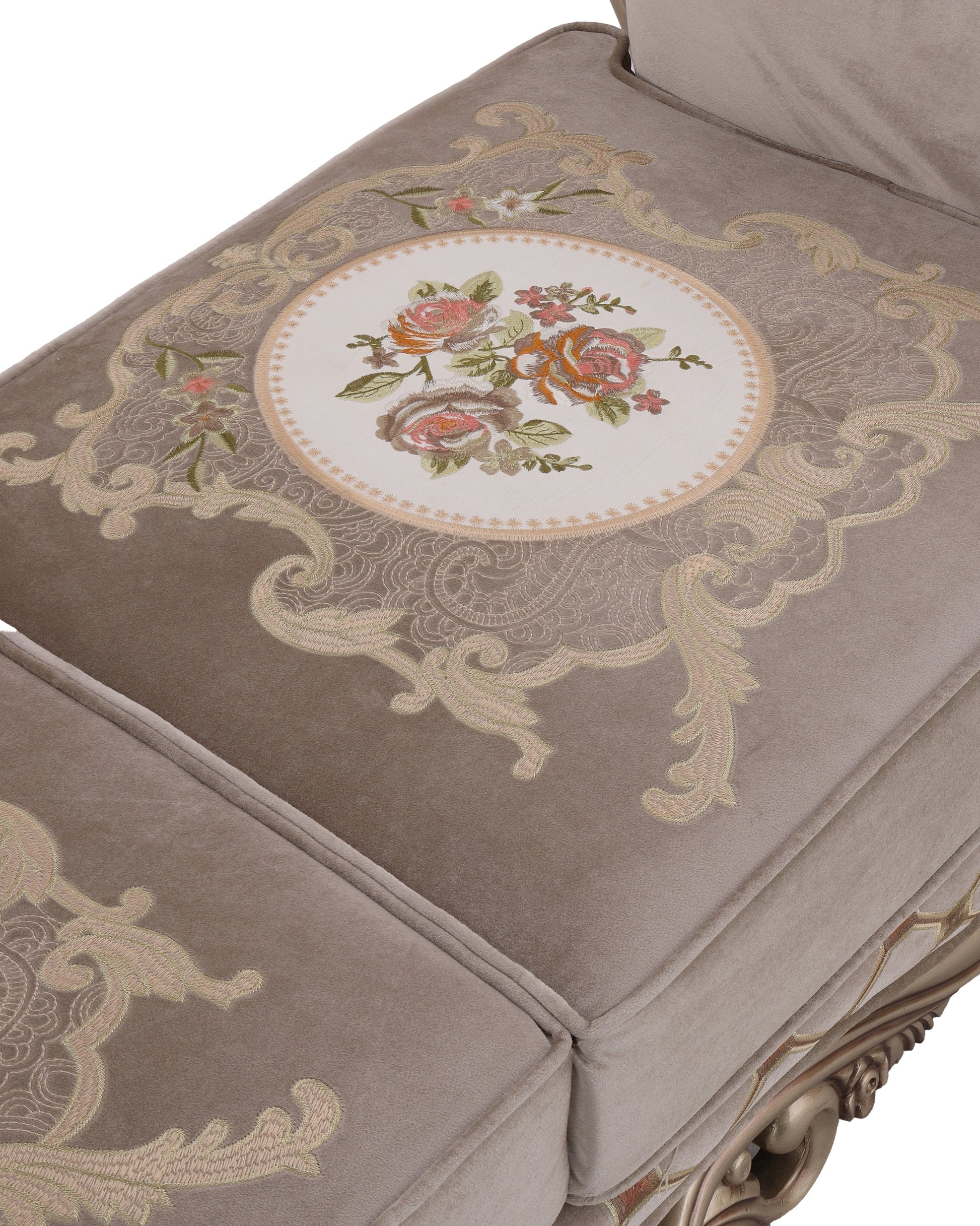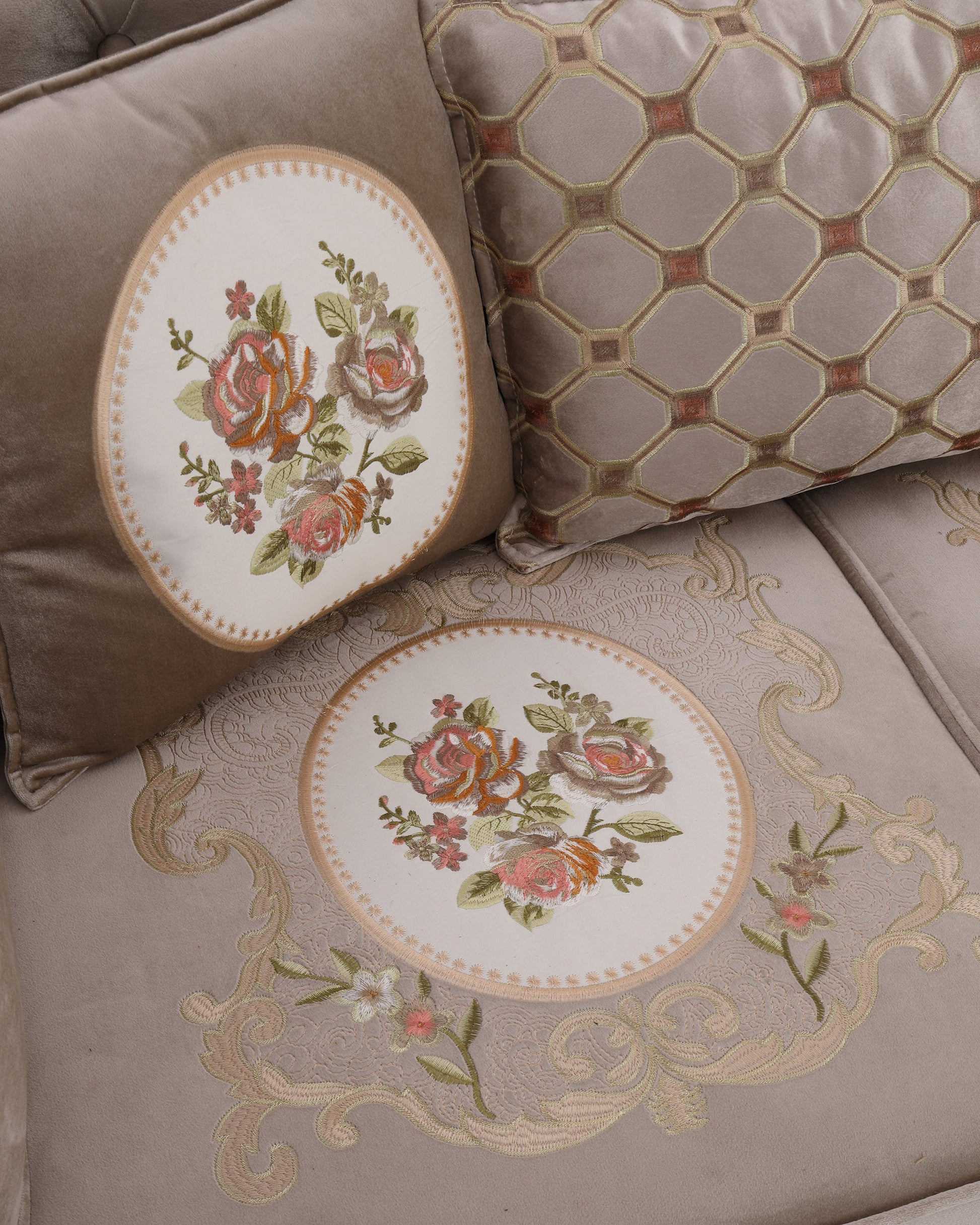 The SAMRAT Sofa Set is a masterful expression of royal elegance and detailed craftsmanship. Featuring sweeping curves, high-back tufted seating, and ornate hand-carved wooden frames, this set offers a striking centerpiece for traditional and opulent living rooms. Richly embroidered cushions and soft champagne velvet upholstery add to its regal allure, making SAMRAT an heirloom-worthy piece for refined interiors.