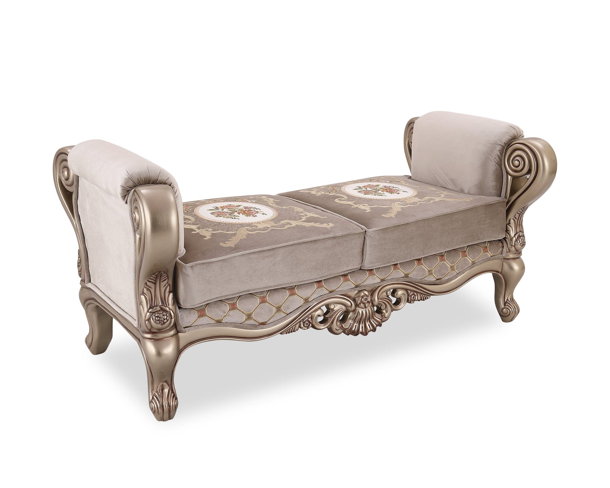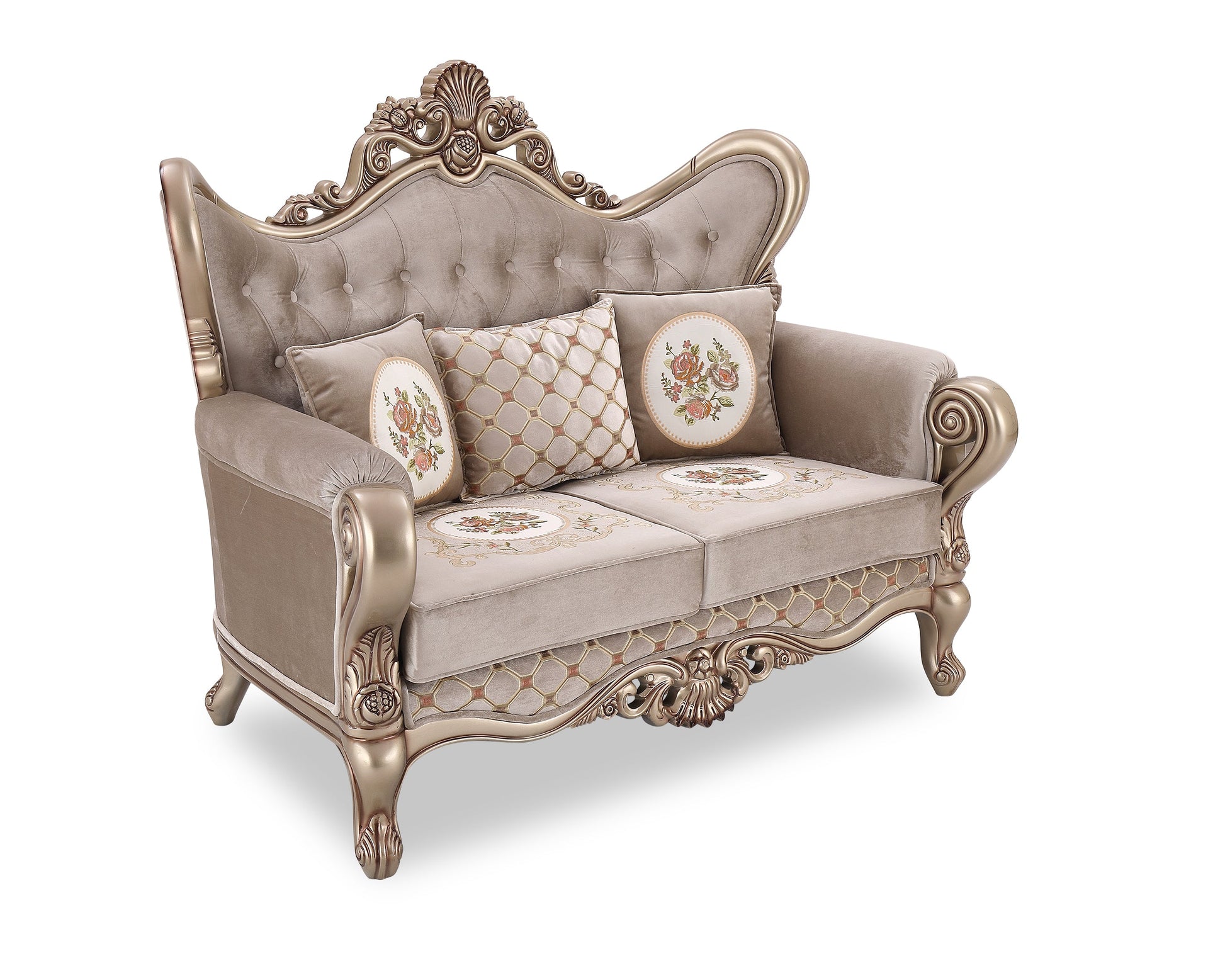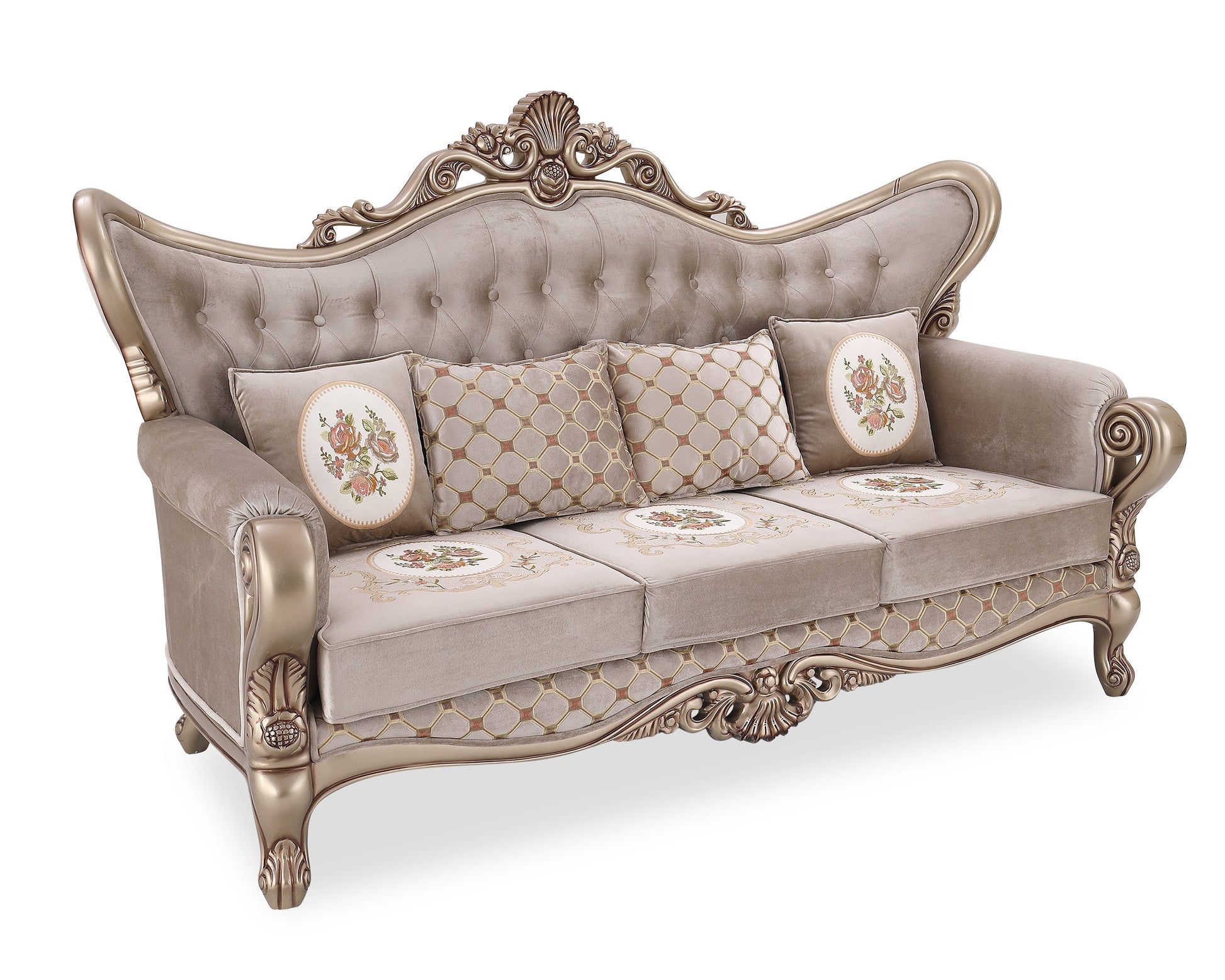 The SAMRAT Sofa Set is a masterful expression of royal elegance and detailed craftsmanship. Featuring sweeping curves, high-back tufted seating, and ornate hand-carved wooden frames, this set offers a striking centerpiece for traditional and opulent living rooms. Richly embroidered cushions and soft champagne velvet upholstery add to its regal allure, making SAMRAT an heirloom-worthy piece for refined interiors.