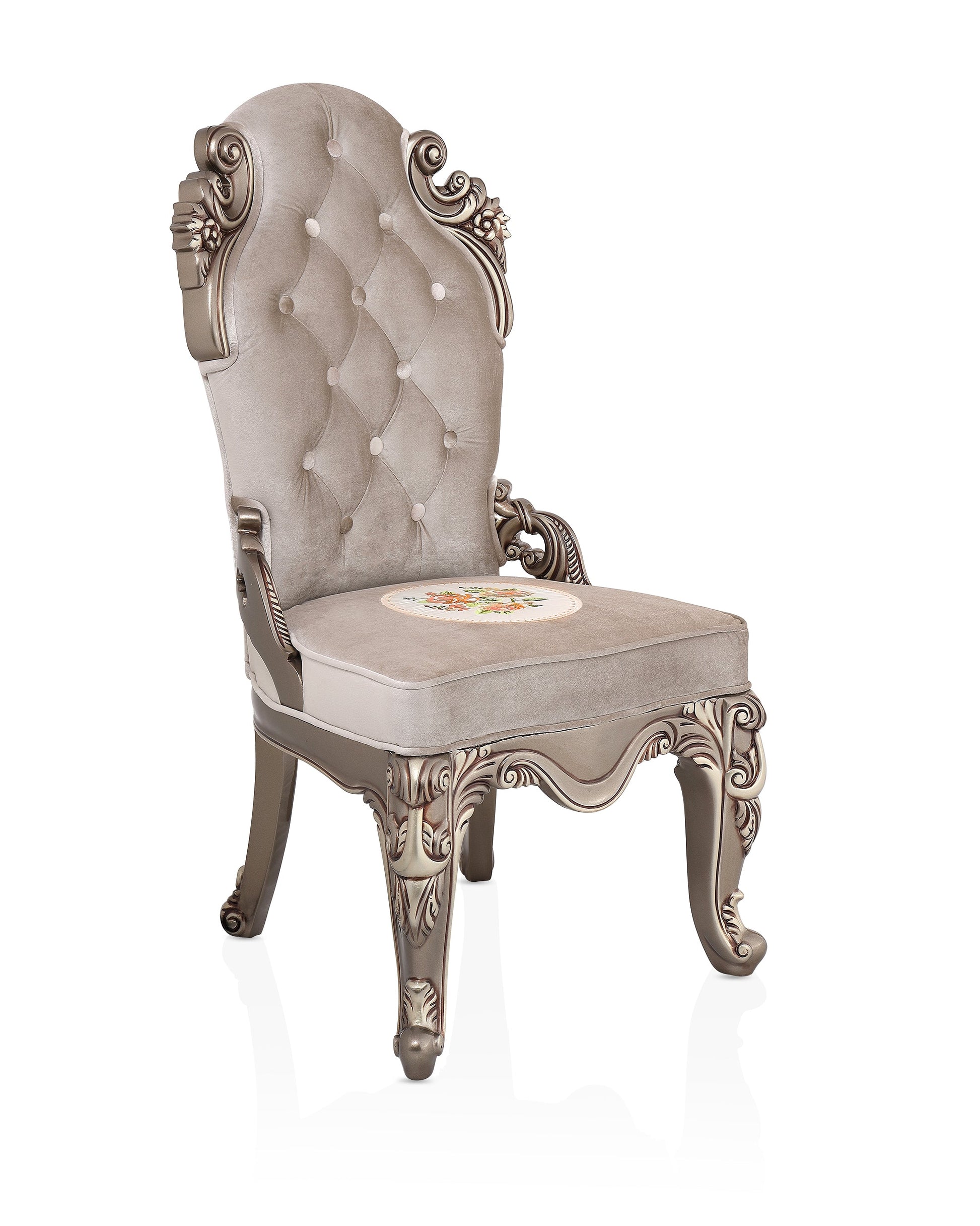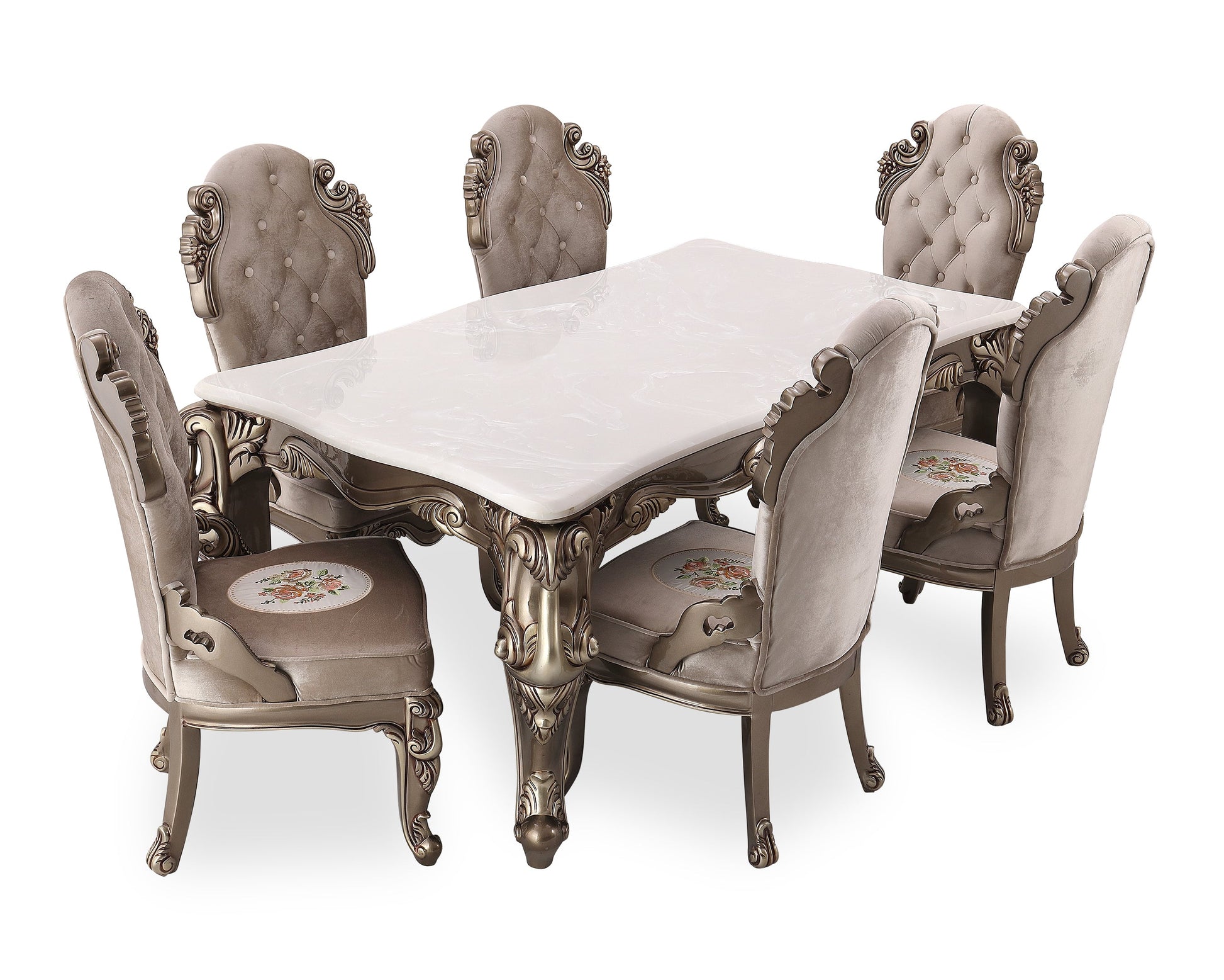 Bring timeless elegance to your dining room with the SHIRAZ dining set — a refined blend of classic design, floral accents, and premium craftsmanship. Its velvet-finish high-back chairs, detailed carvings, and lustrous marble top create a luxurious dining ambiance.