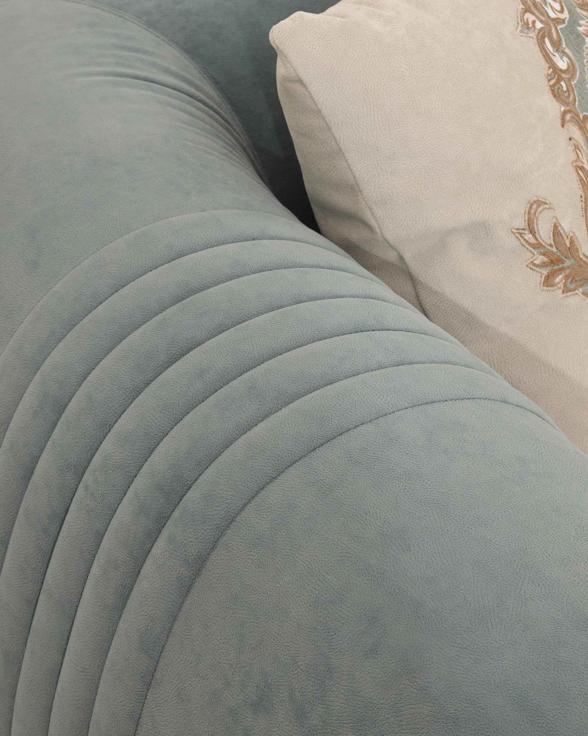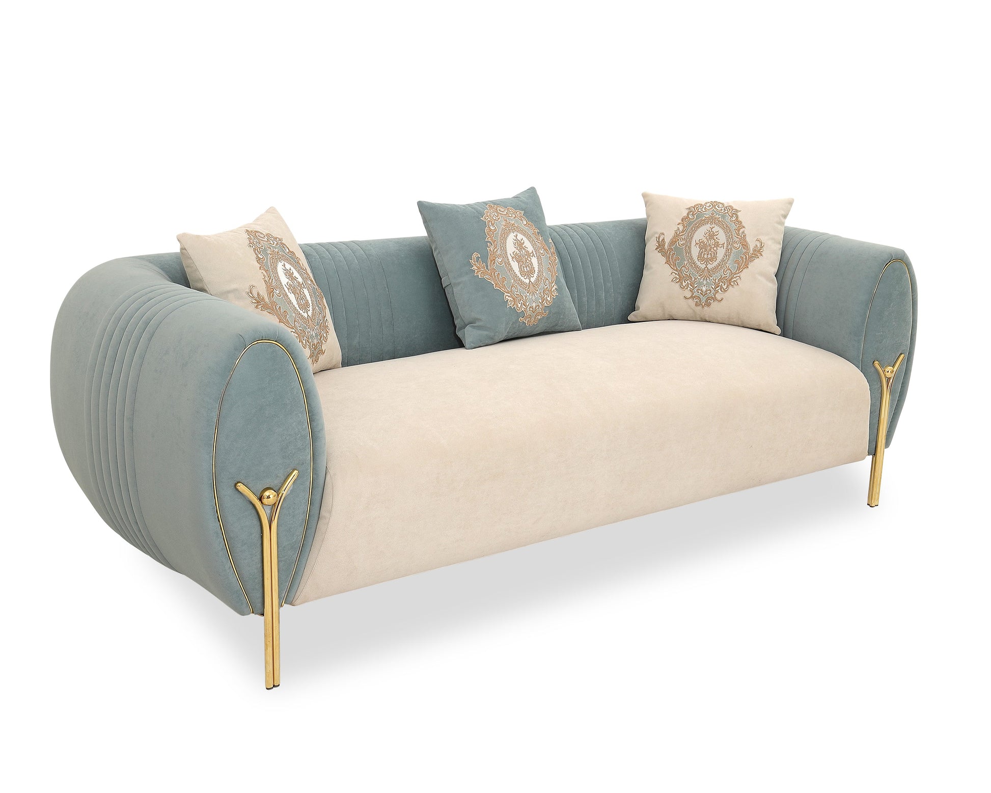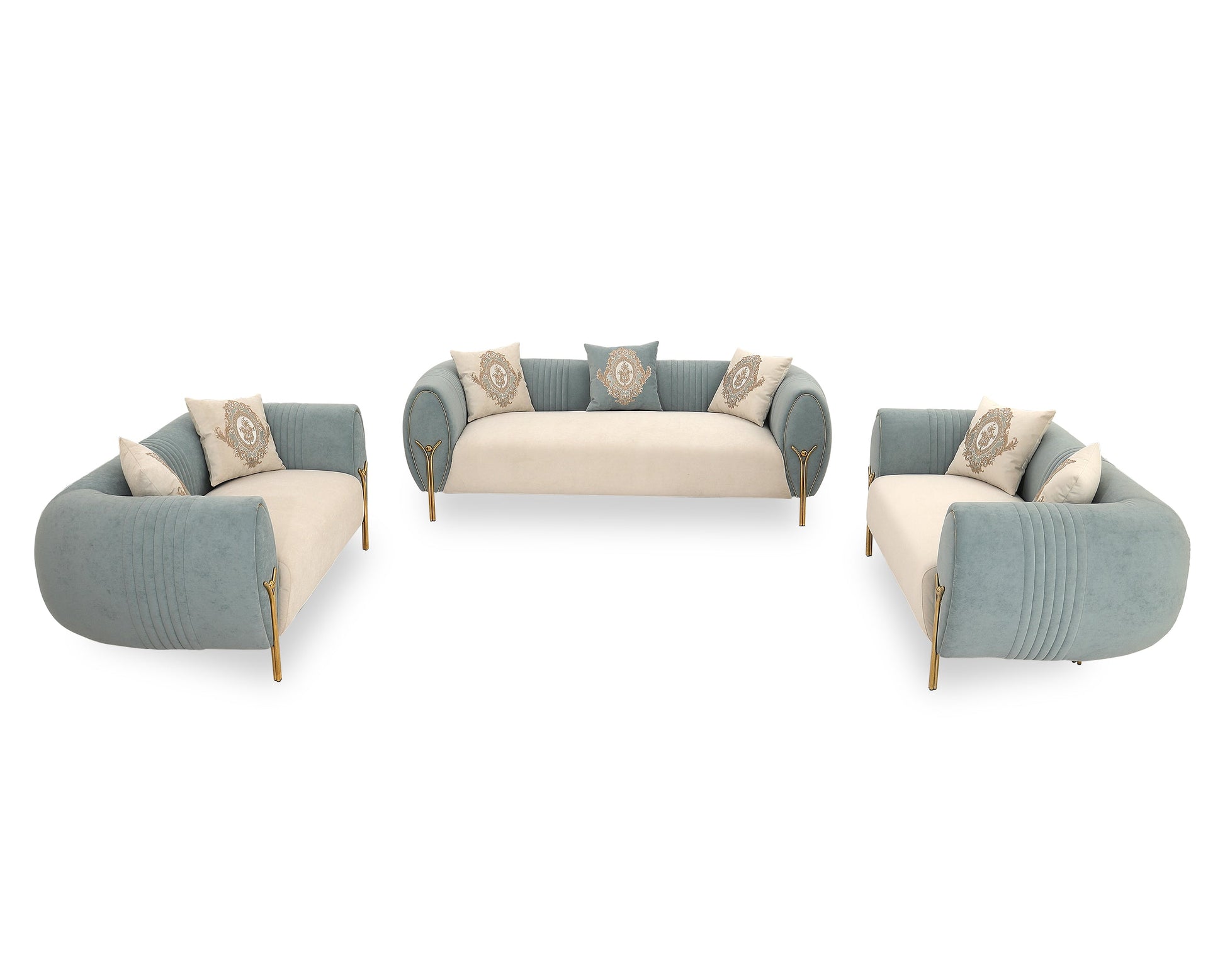 The TEAPARTY Sofa Set brings a refreshing burst of modern style with its charming pastel tones and soft curves. Upholstered in a dual-tone palette of cream and dusty teal, this set effortlessly balances elegance with everyday comfort. Gold-finished leg accents and plush embroidered cushions enhance the overall sophistication, making TEAPARTY a standout in any contemporary home.