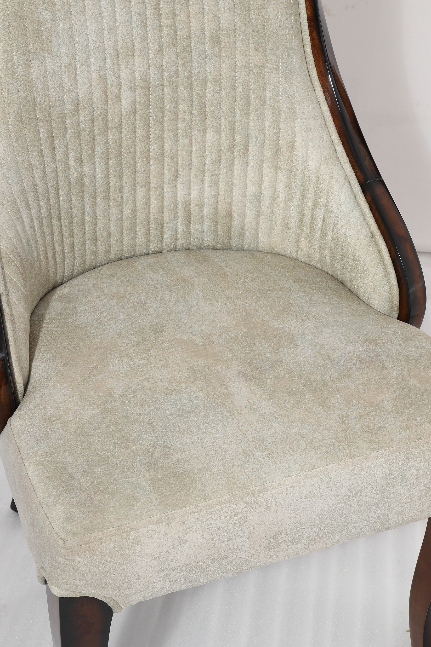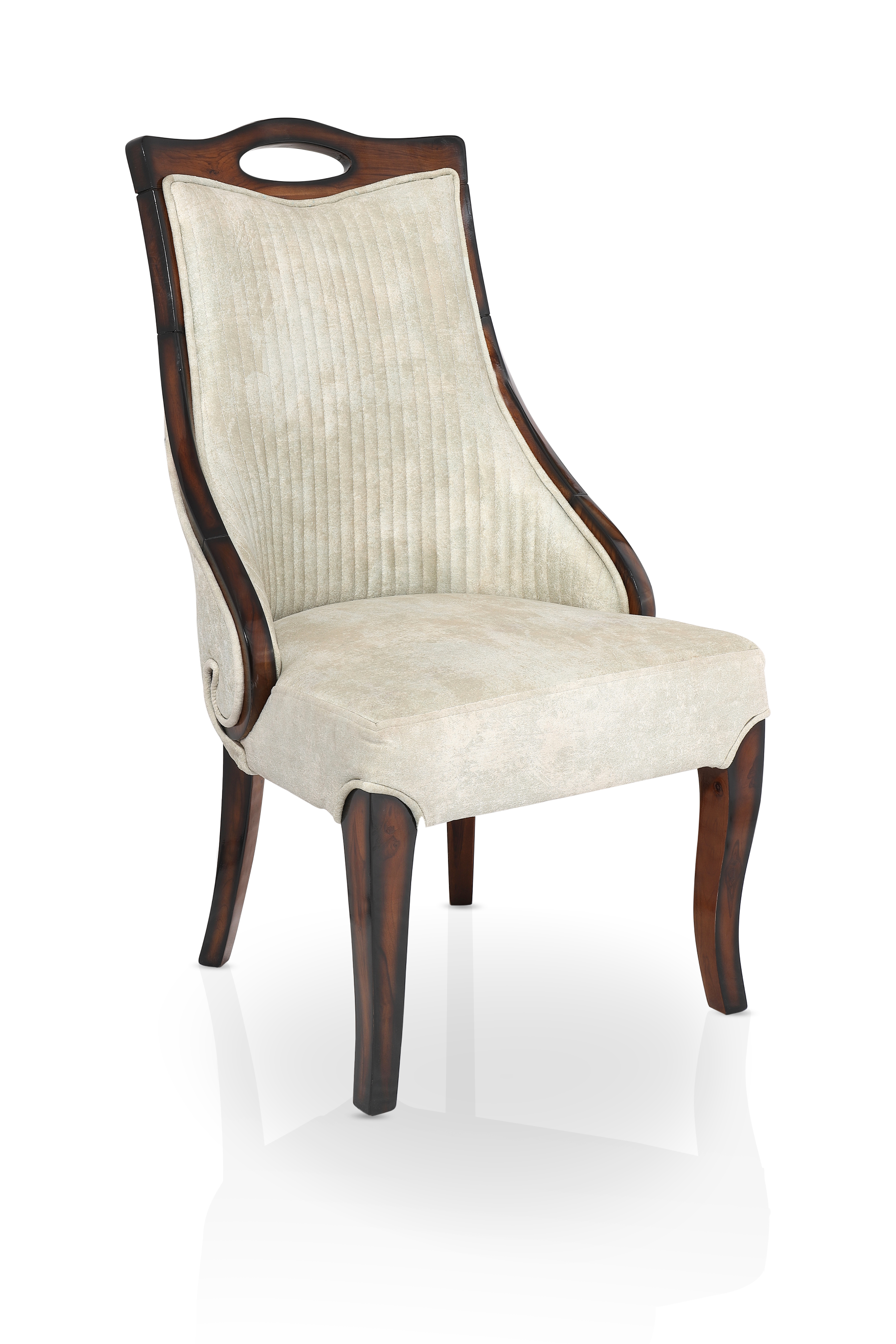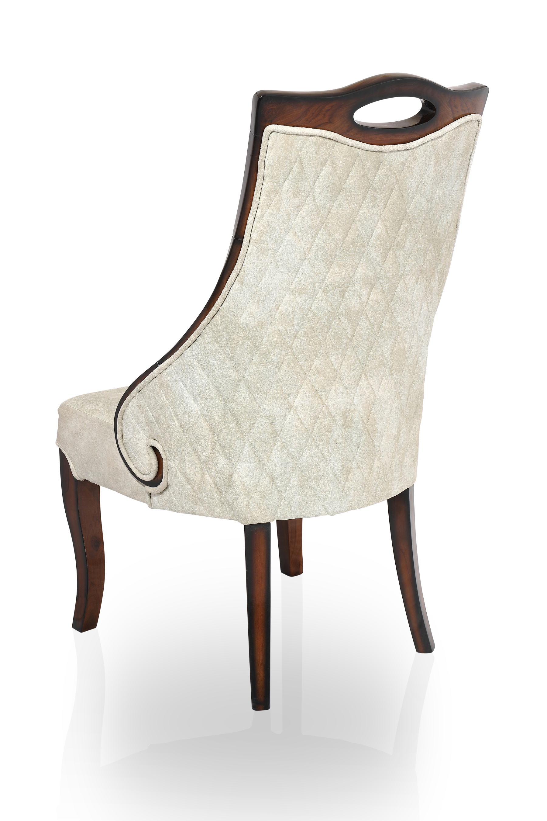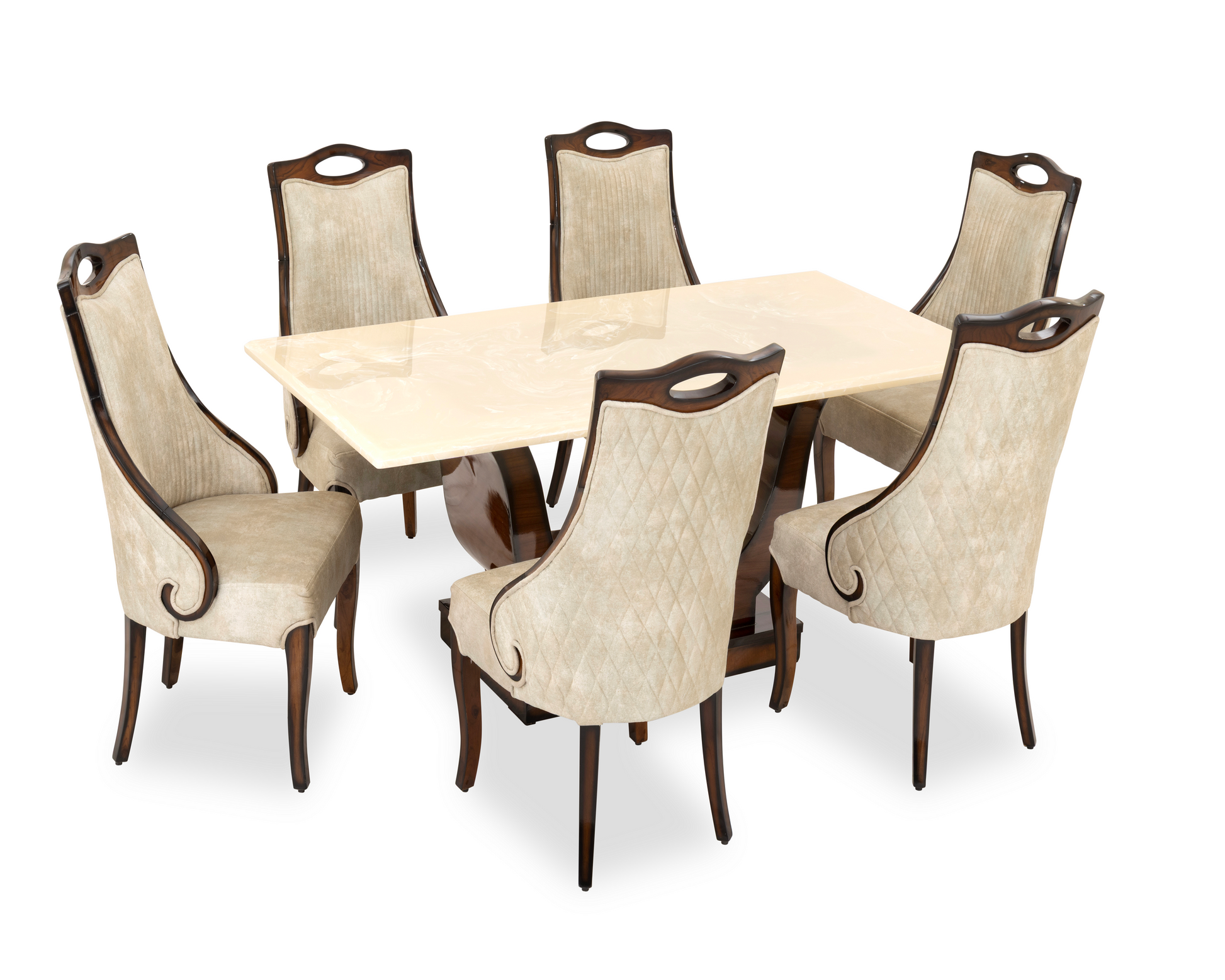 The TULIP Dining Set blends traditional charm with functional grace. Crafted with a beautifully polished marble tabletop and supported by a carved dual-pedestal wooden base, it sets the tone for regal dining. The velvet-upholstered chairs feature quilted backs, subtle scroll arms, and cut-out crown handles — adding ease, sophistication, and style to every meal.